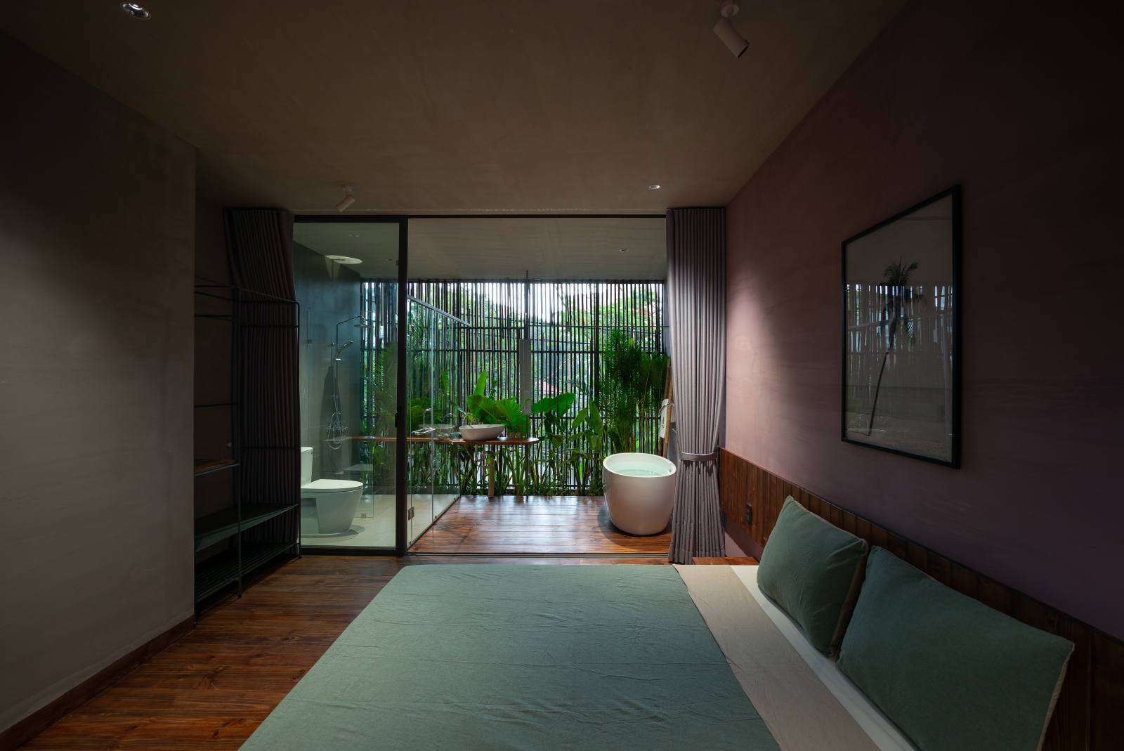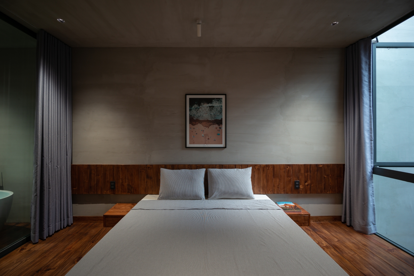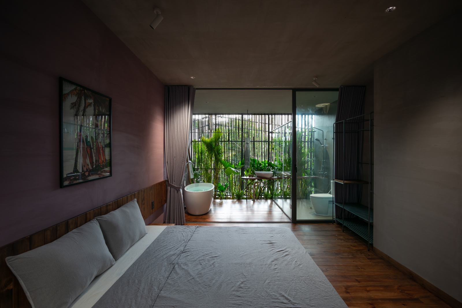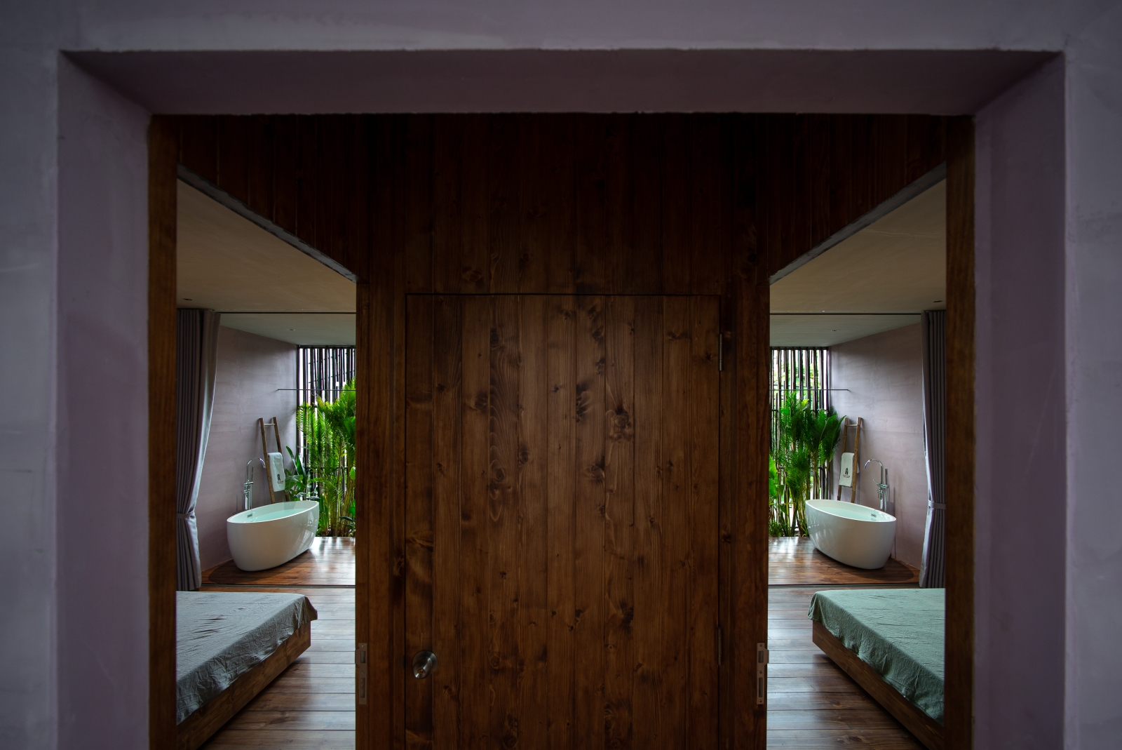 - Tầng hai gồm 4 phòng với sức tối đa là 16 khách, ở giữa là hành lang cầu và khoảng thông tầng tạo sư riêng biệt cho 4 phòng ngủ, đồng thời kết nối 4 phòng ngủ với không gian phía dưới, tạo dòng đối lưu không khí cho các không gian bên trong và bên ngoài.
