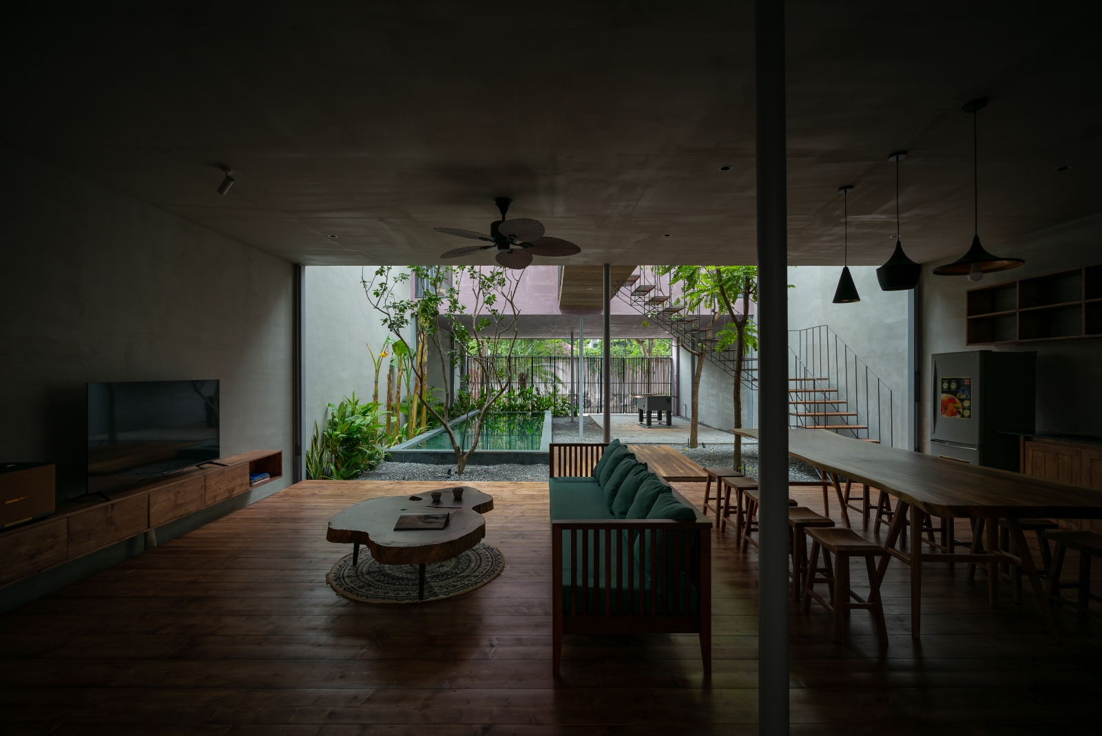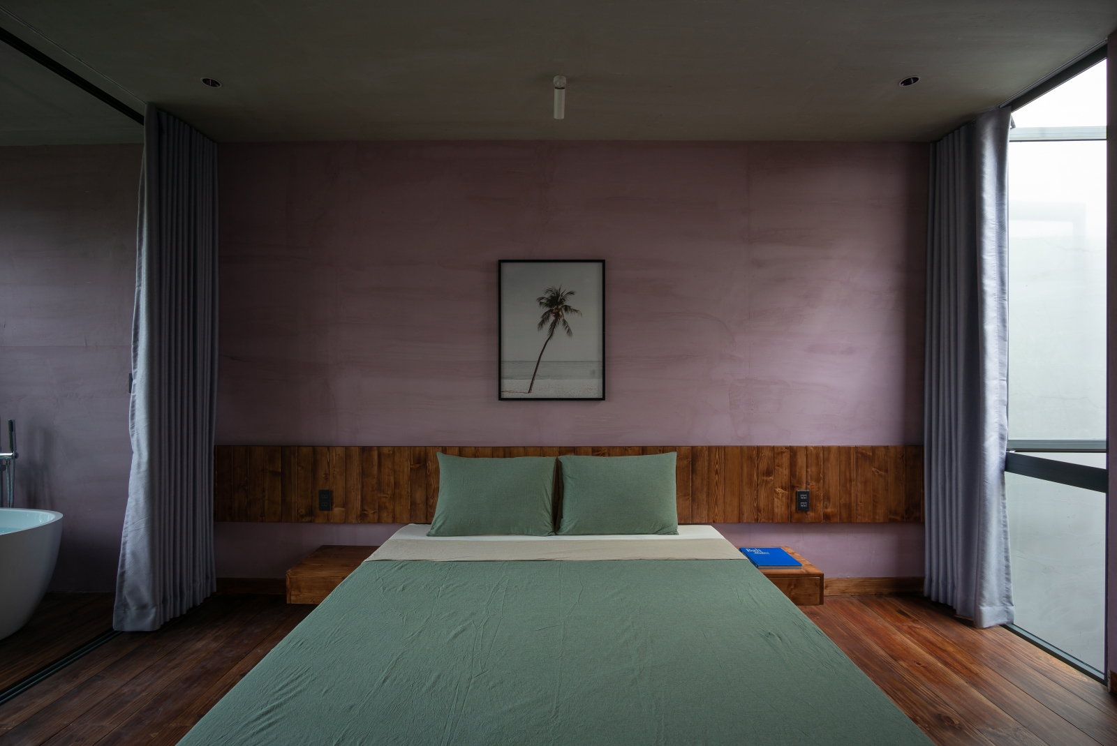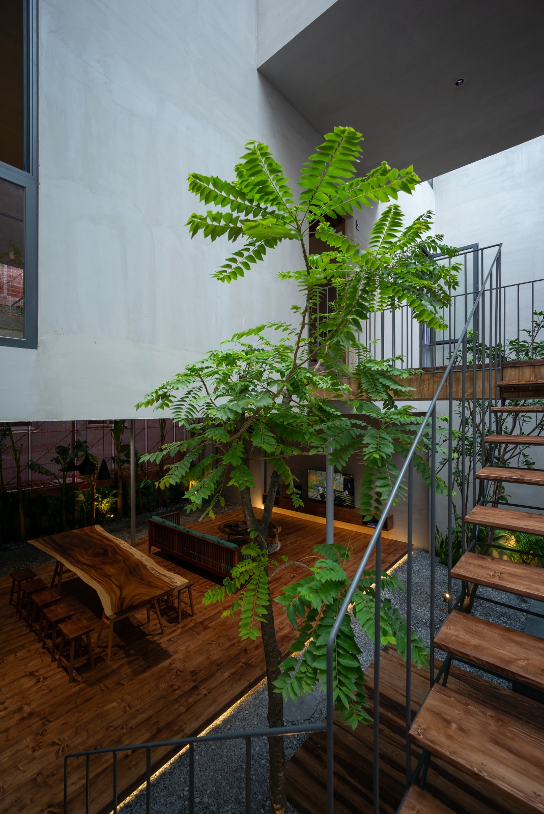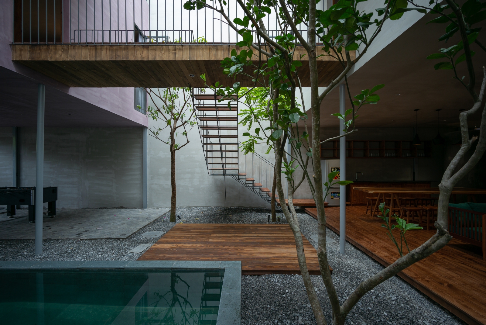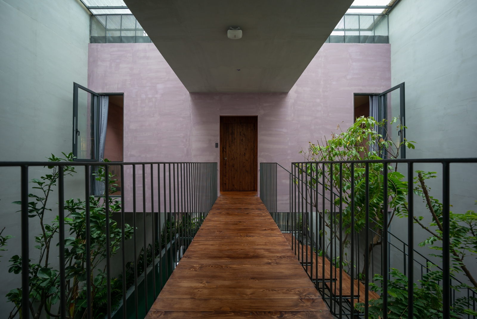 - Tầng hai gồm 4 phòng với sức tối đa là 16 khách, ở giữa là hành lang cầu và khoảng thông tầng tạo sư riêng biệt cho 4 phòng ngủ, đồng thời kết nối 4 phòng ngủ với không gian phía dưới, tạo dòng đối lưu không khí cho các không gian bên trong và bên ngoài.