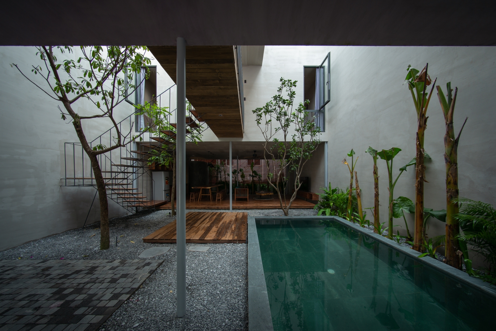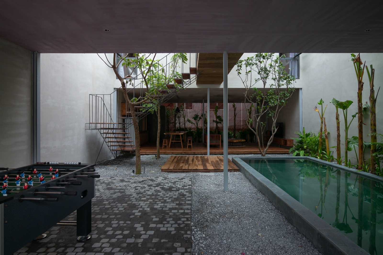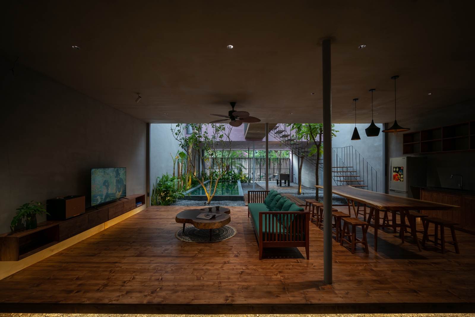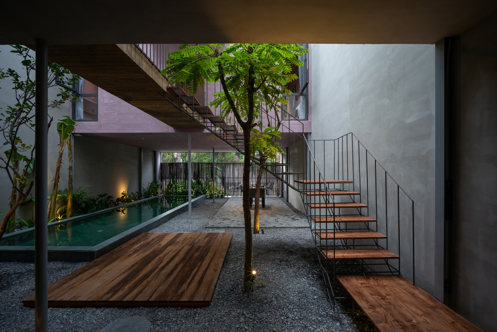 - Tầng hai gồm 4 phòng với sức tối đa là 16 khách, ở giữa là hành lang cầu và khoảng thông tầng tạo sư riêng biệt cho 4 phòng ngủ, đồng thời kết nối 4 phòng ngủ với không gian phía dưới, tạo dòng đối lưu không khí cho các không gian bên trong và bên ngoài.