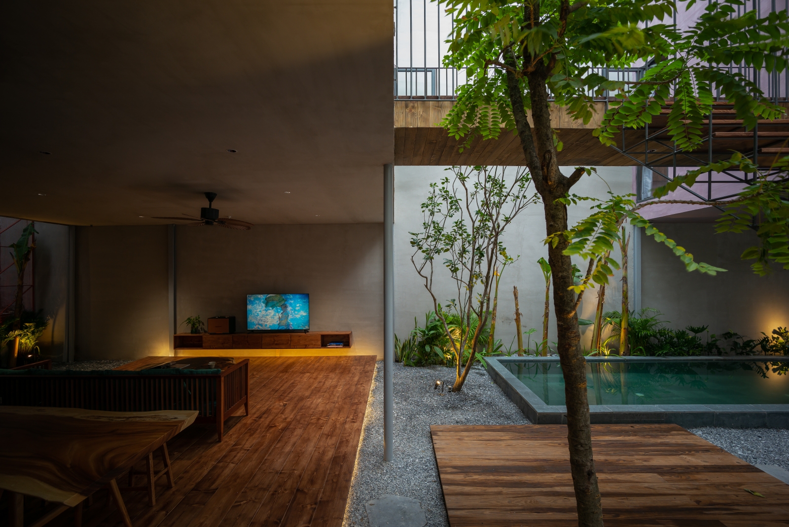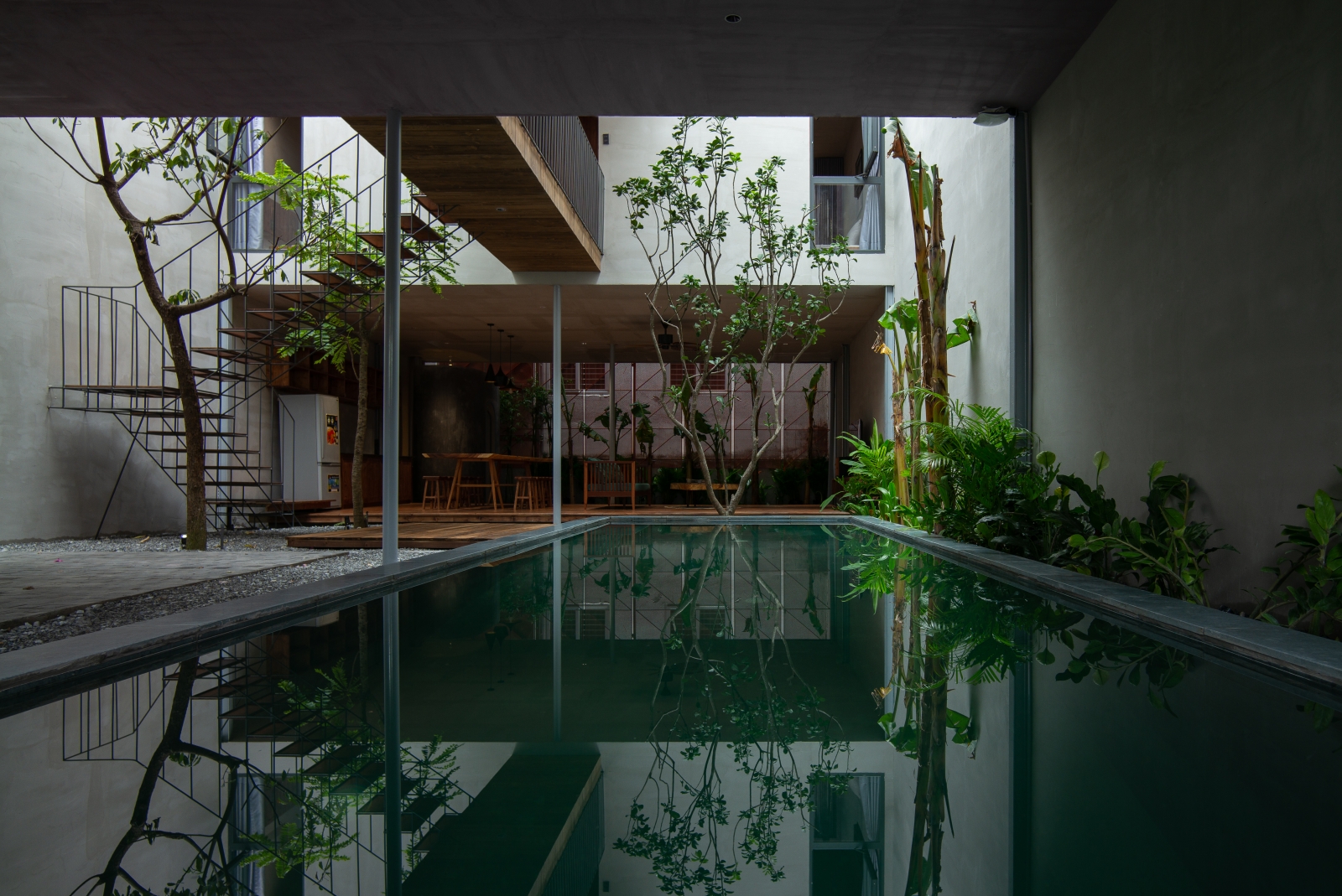- Tầng một là những ô sàn xen kẽ nhau với khu vực không gian chức năng mở, có gara và hồ bơi, phía trước là phòng khách, lui về phía sau là phòng ăn, bếp, cùng với các mảng cây xanh quen thuộc mà có lần chúng mình chợt nhớ rằng ngày bé đã từng ngồi dưới góc cây nghe bà kể chuyện như thế ấy.