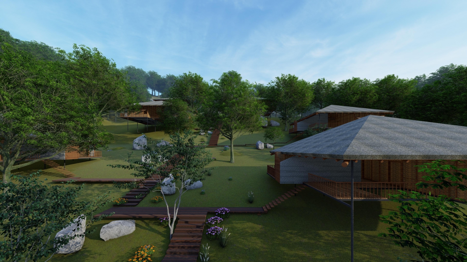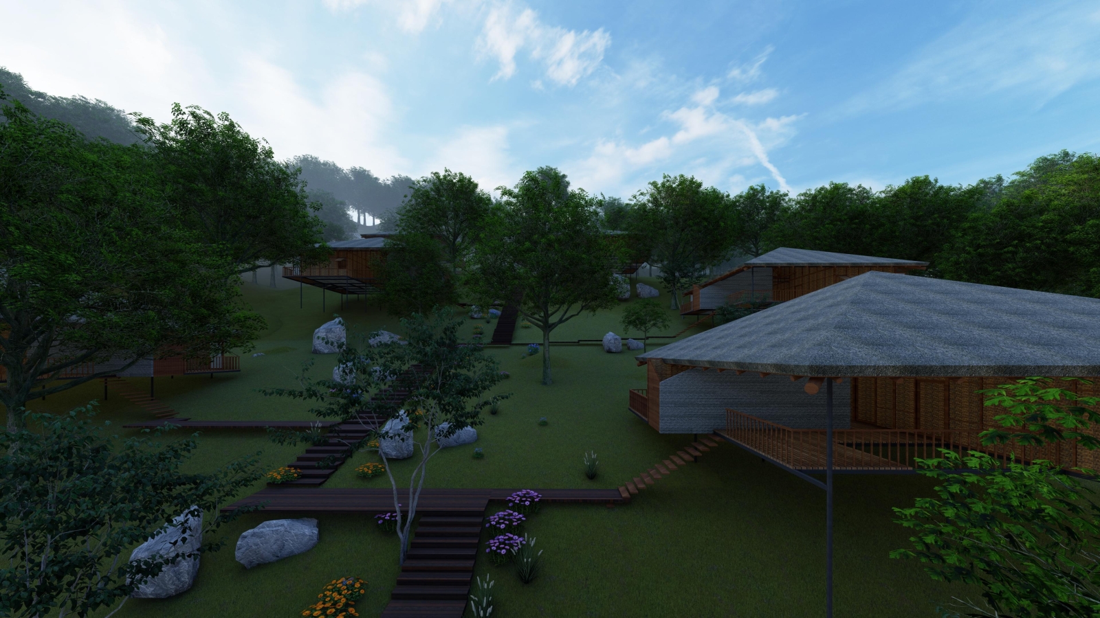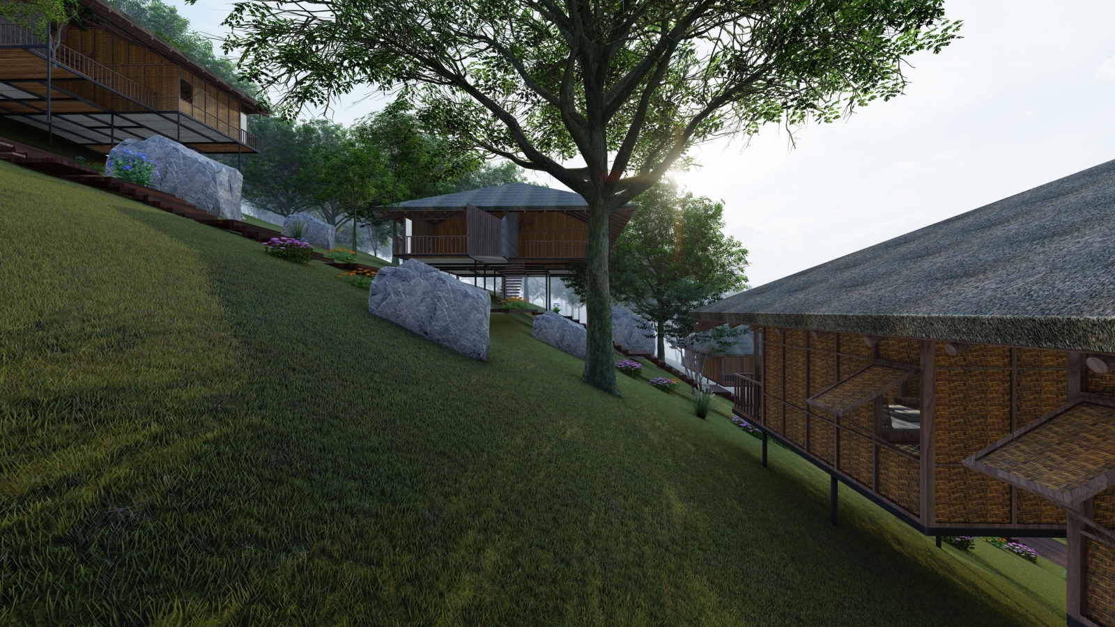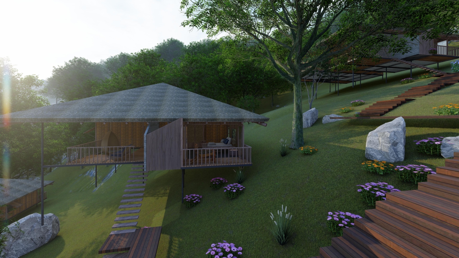 CĐT tìm đến chúng tôi với mong muốn hình thành một khu nghỉ dưỡng vừa và nhỏ với mong muốn không tác động quá nhiều tới hiện trạng khu đất và cây cối hiện hữu, thi công nhanh chóng, dễ dàng xin phép xây dựng. Vì vậy chúng tôi đề xuất phương án cho khu nghỉ dưỡng với kết cấu chính là sắt, kết hợp với gỗ và mái lợp lá dừa. Các khối Bugalow nghỉ dưỡng được đặt ở vị trí cao nhất của khu đất để lấy được view nhìn tốt nhất và cách xa đường quốc lộ phía dưới.