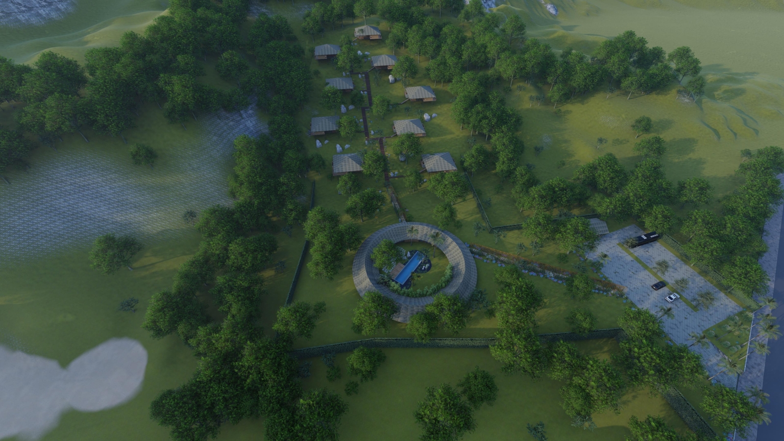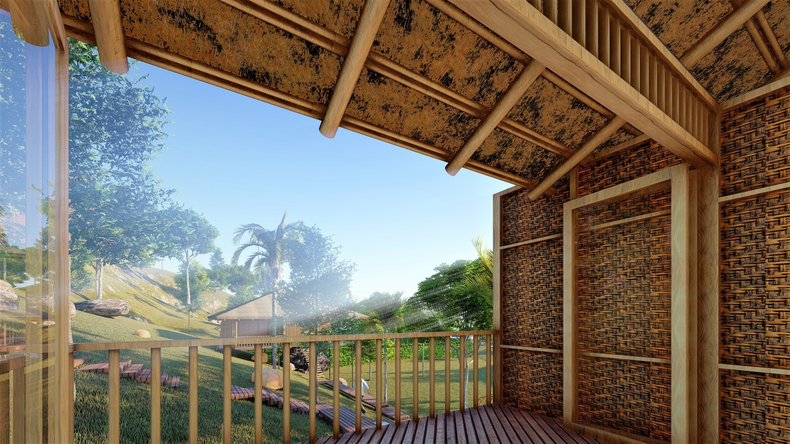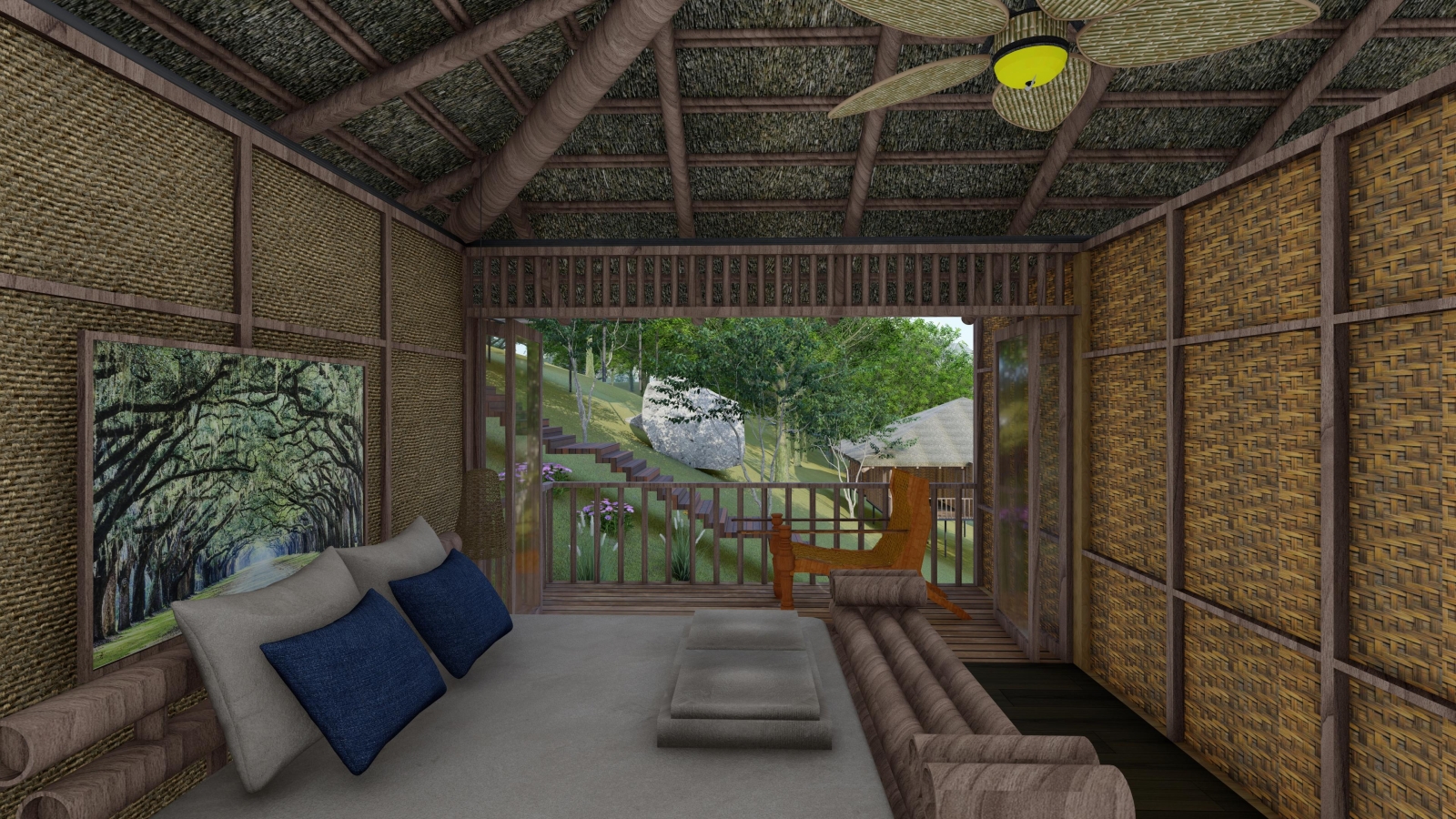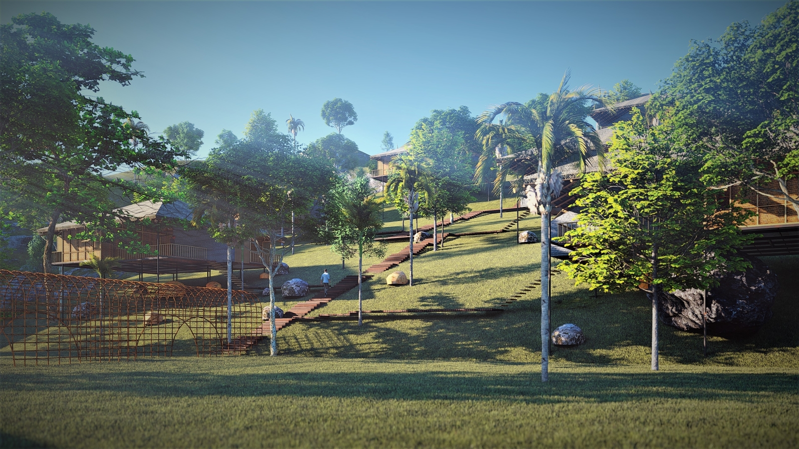 CĐT tìm đến chúng tôi với mong muốn hình thành một khu nghỉ dưỡng vừa và nhỏ với mong muốn không tác động quá nhiều tới hiện trạng khu đất và cây cối hiện hữu, thi công nhanh chóng, dễ dàng xin phép xây dựng. Vì vậy chúng tôi đề xuất phương án cho khu nghỉ dưỡng với kết cấu chính là sắt, kết hợp với gỗ và mái lợp lá dừa. Các khối Bugalow nghỉ dưỡng được đặt ở vị trí cao nhất của khu đất để lấy được view nhìn tốt nhất và cách xa đường quốc lộ phía dưới.