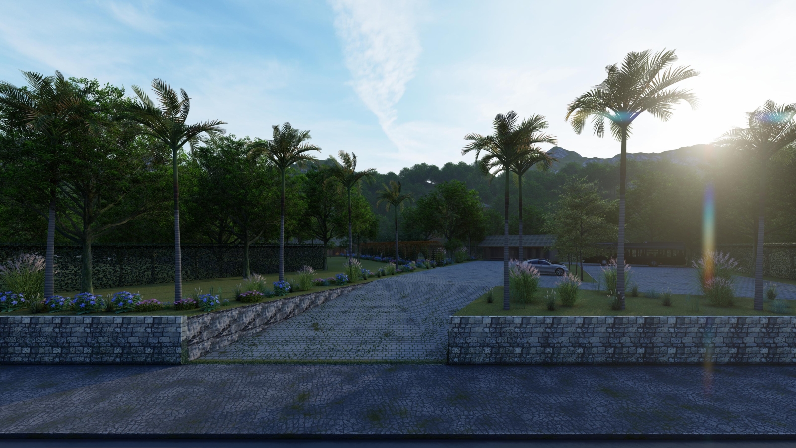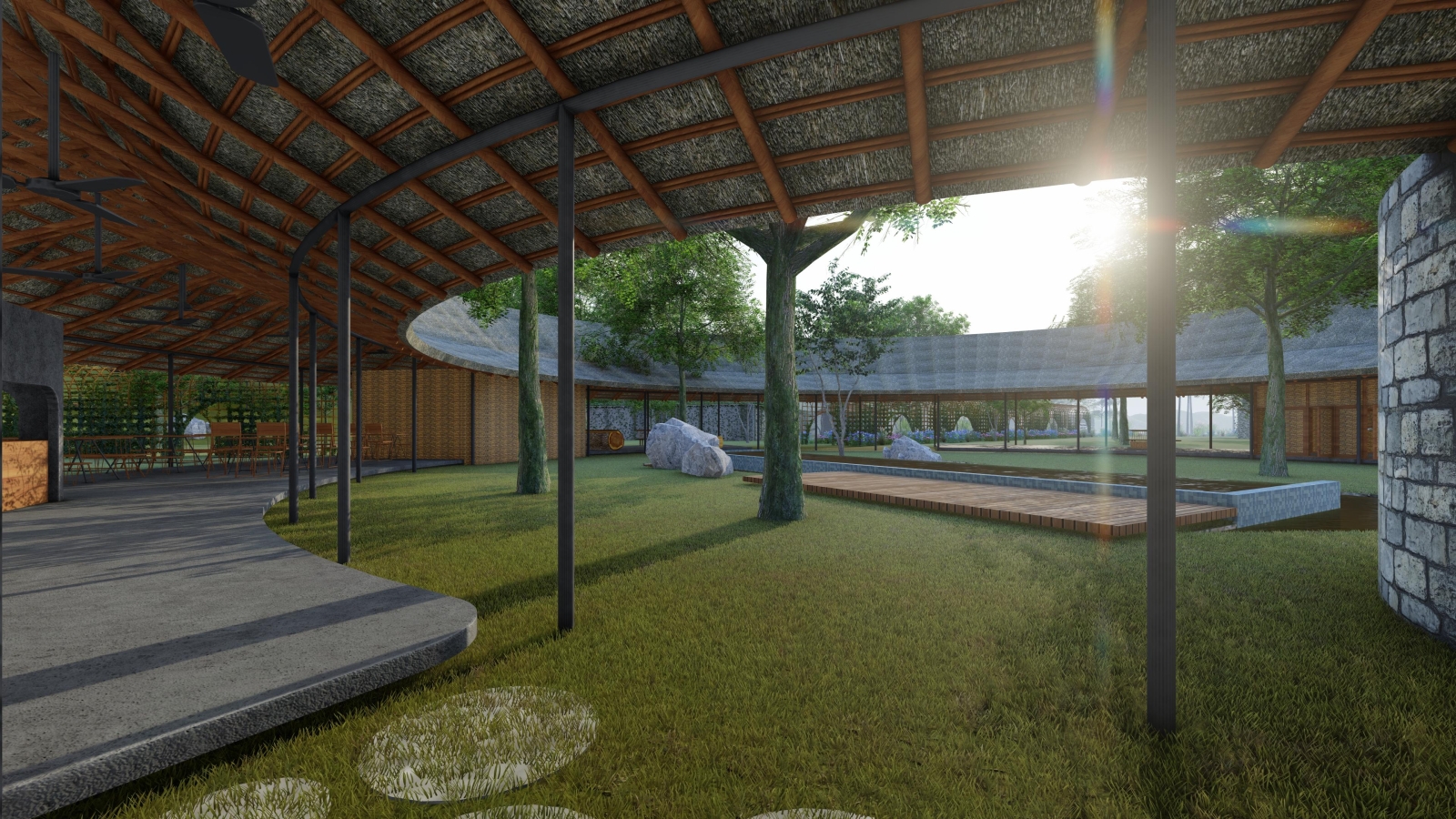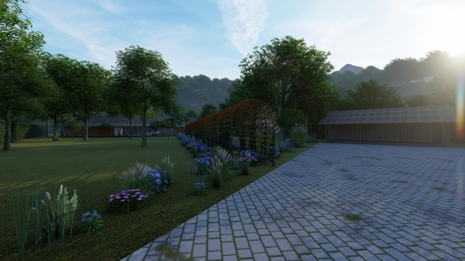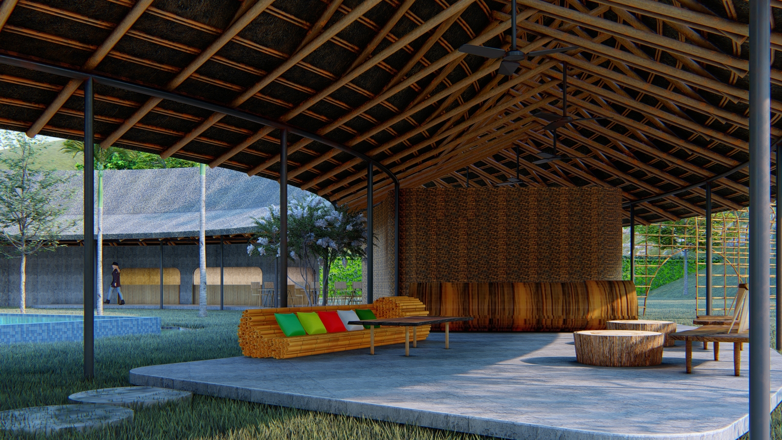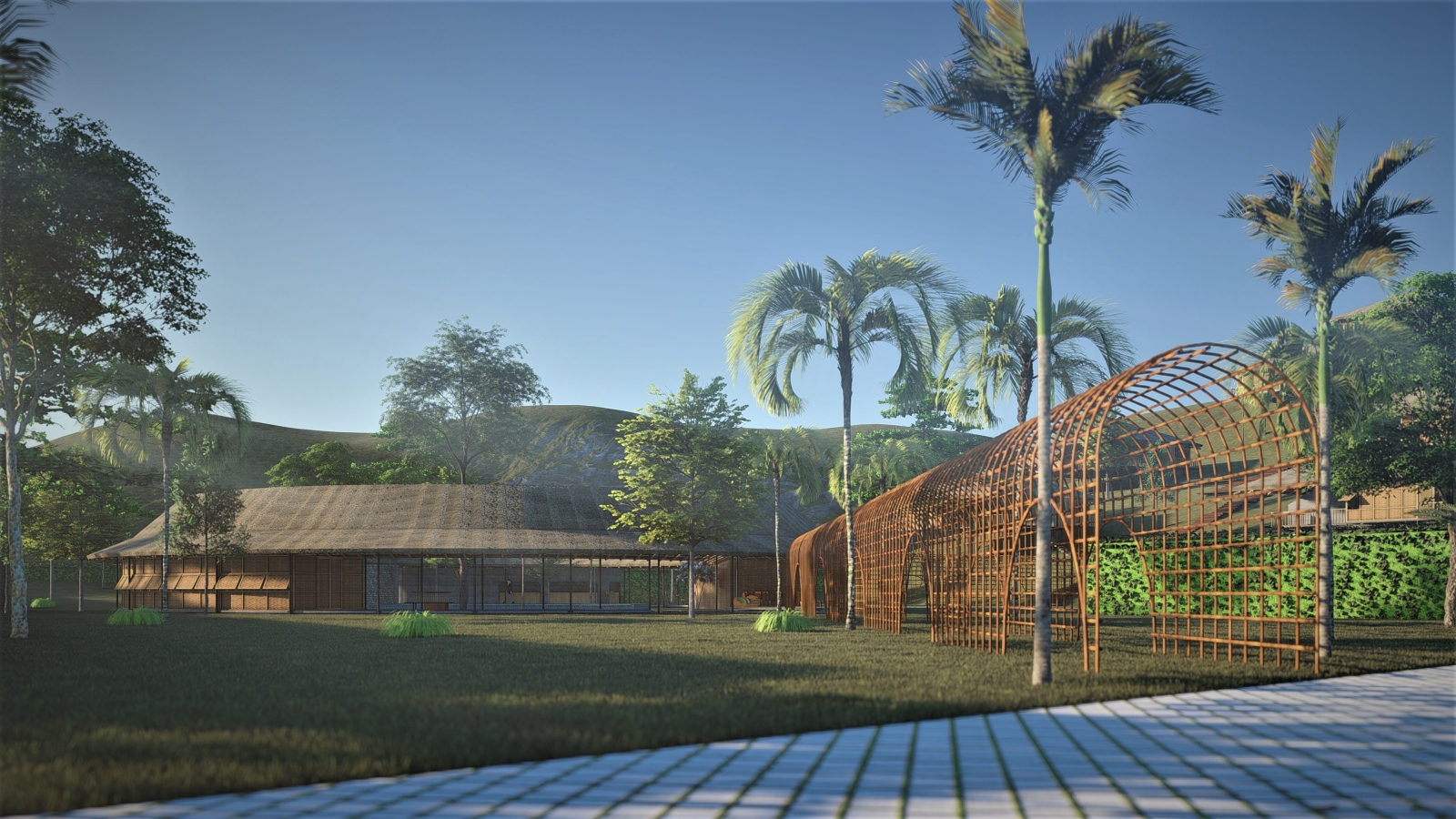 CĐT tìm đến chúng tôi với mong muốn hình thành một khu nghỉ dưỡng vừa và nhỏ với mong muốn không tác động quá nhiều tới hiện trạng khu đất và cây cối hiện hữu, thi công nhanh chóng, dễ dàng xin phép xây dựng. Vì vậy chúng tôi đề xuất phương án cho khu nghỉ dưỡng với kết cấu chính là sắt, kết hợp với gỗ và mái lợp lá dừa. Các khối Bugalow nghỉ dưỡng được đặt ở vị trí cao nhất của khu đất để lấy được view nhìn tốt nhất và cách xa đường quốc lộ phía dưới.