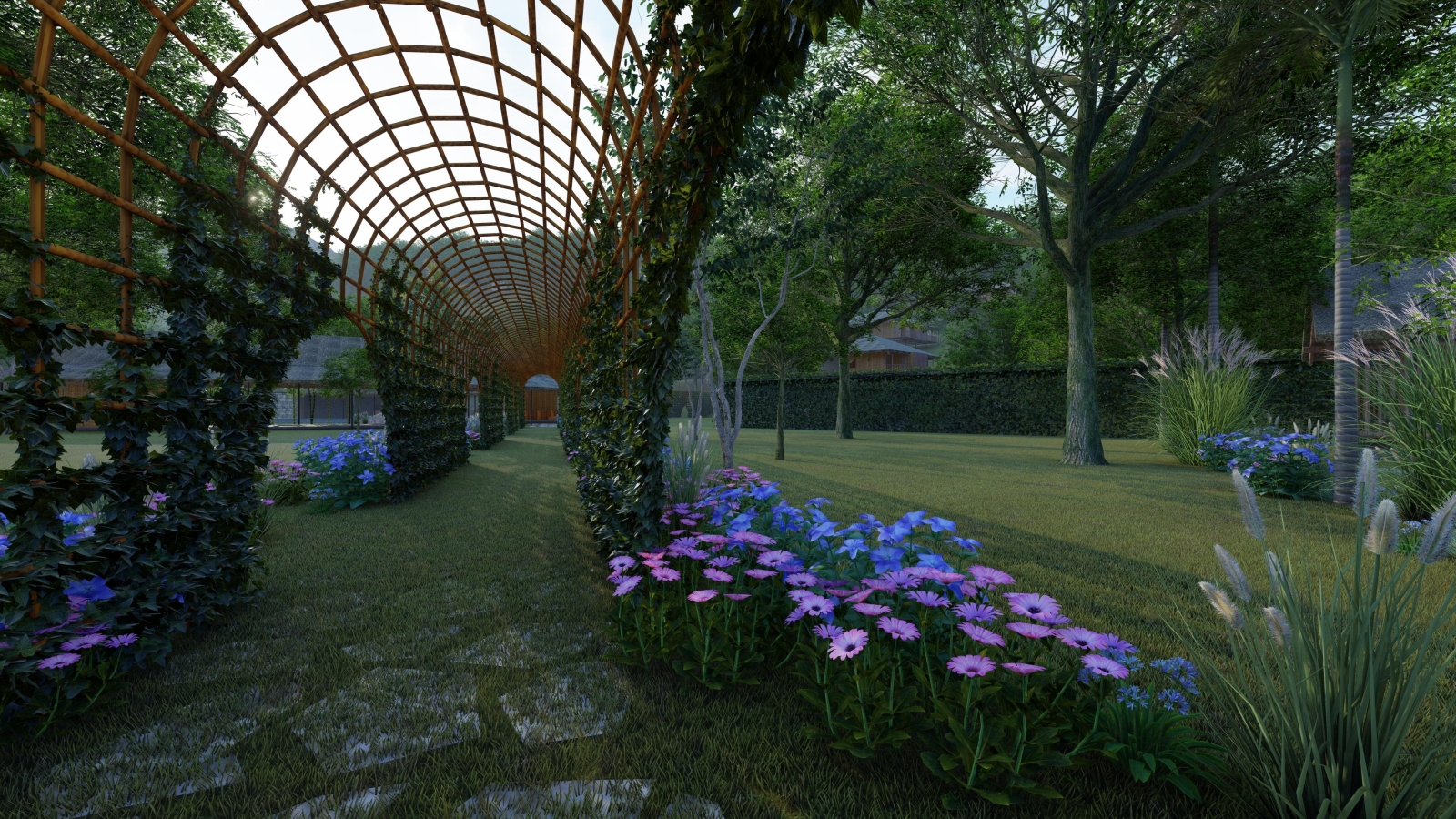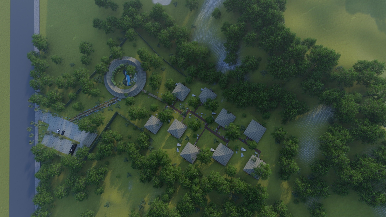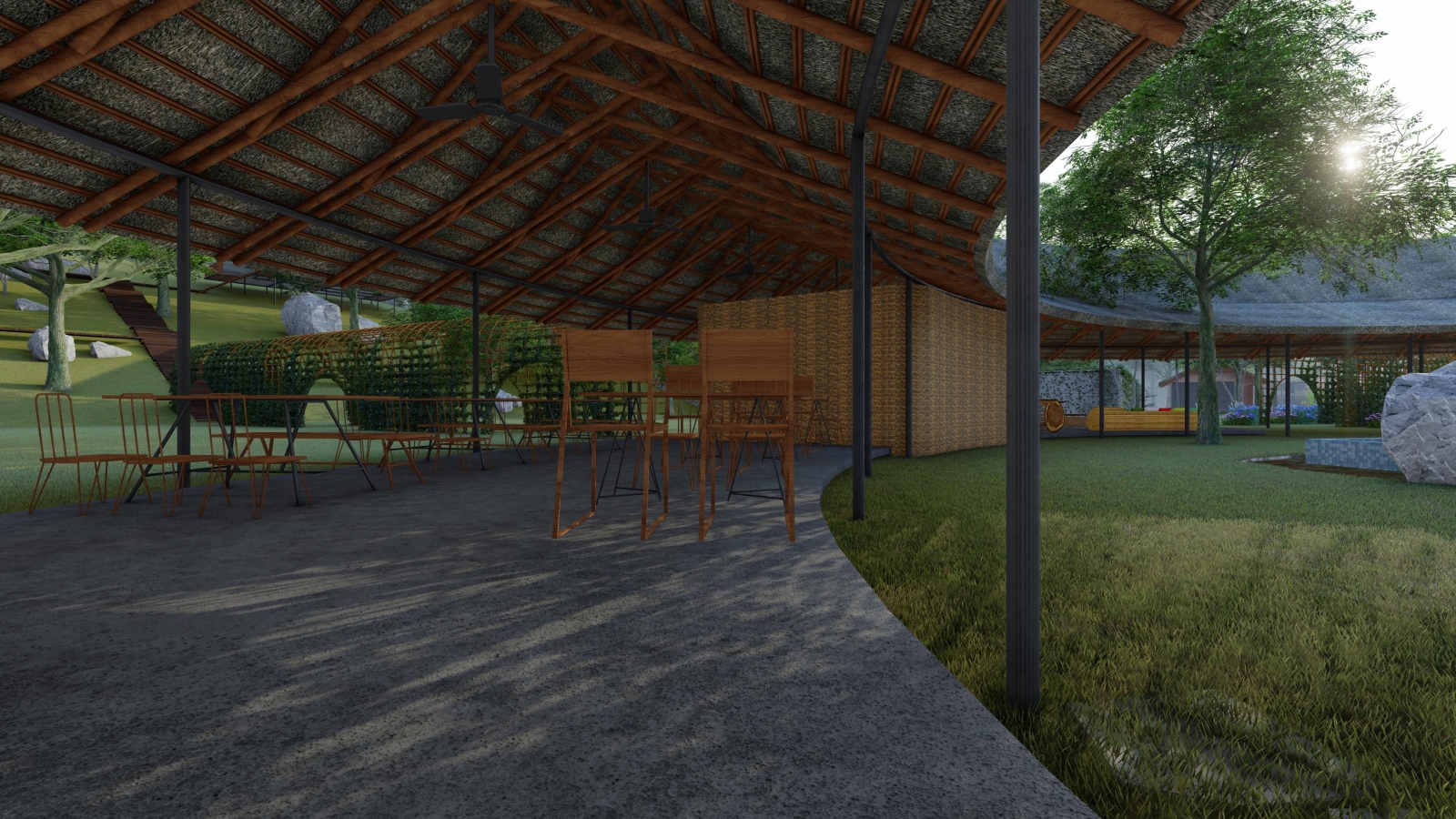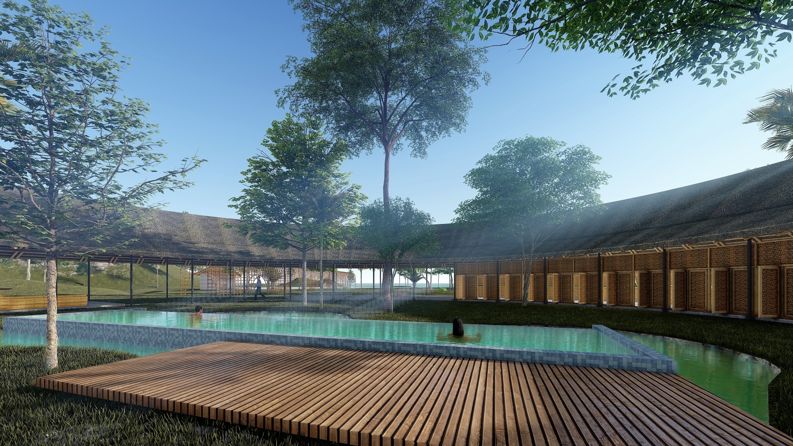 CĐT tìm đến chúng tôi với mong muốn hình thành một khu nghỉ dưỡng vừa và nhỏ với mong muốn không tác động quá nhiều tới hiện trạng khu đất và cây cối hiện hữu, thi công nhanh chóng, dễ dàng xin phép xây dựng. Vì vậy chúng tôi đề xuất phương án cho khu nghỉ dưỡng với kết cấu chính là sắt, kết hợp với gỗ và mái lợp lá dừa. Các khối Bugalow nghỉ dưỡng được đặt ở vị trí cao nhất của khu đất để lấy được view nhìn tốt nhất và cách xa đường quốc lộ phía dưới.