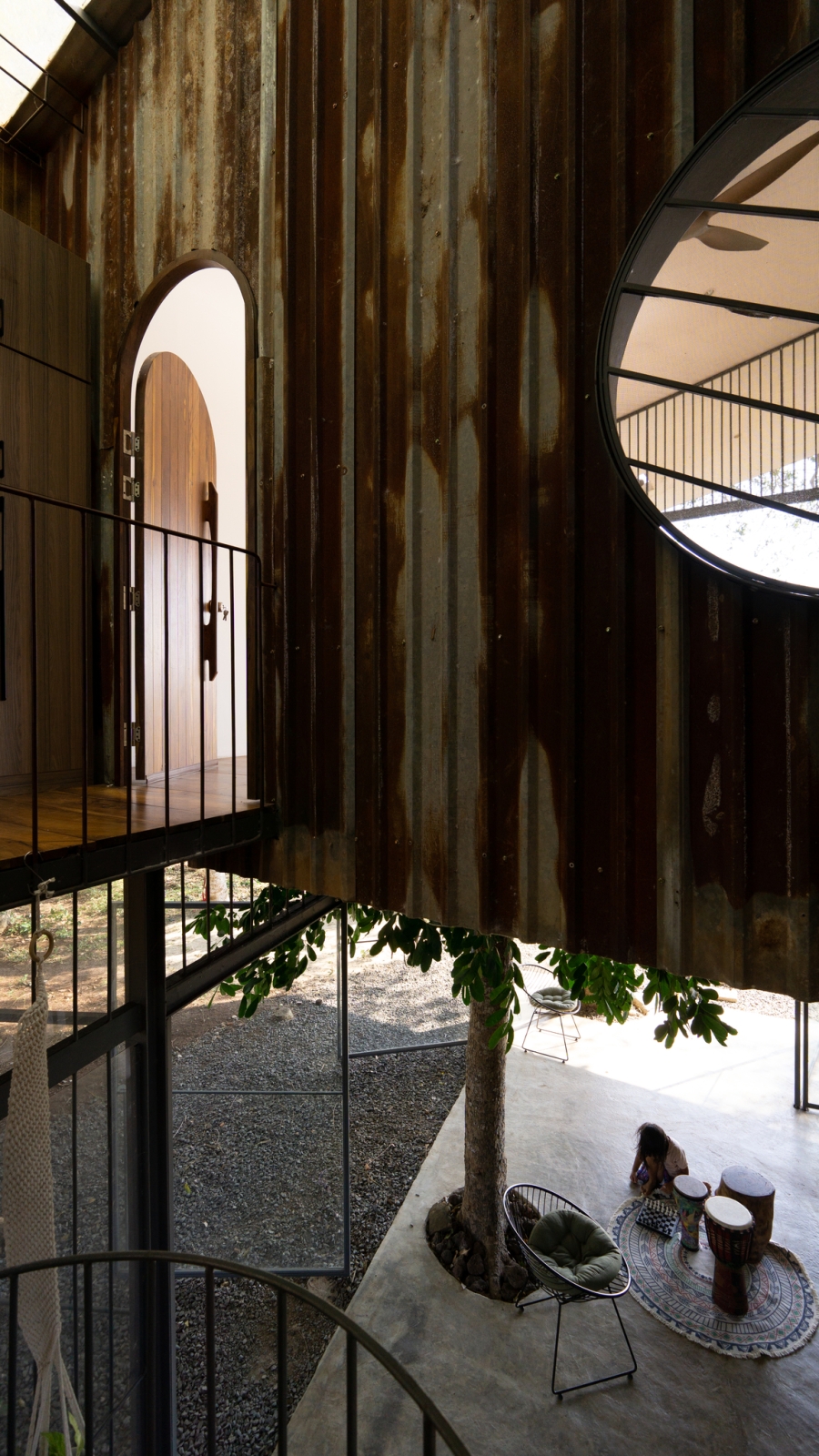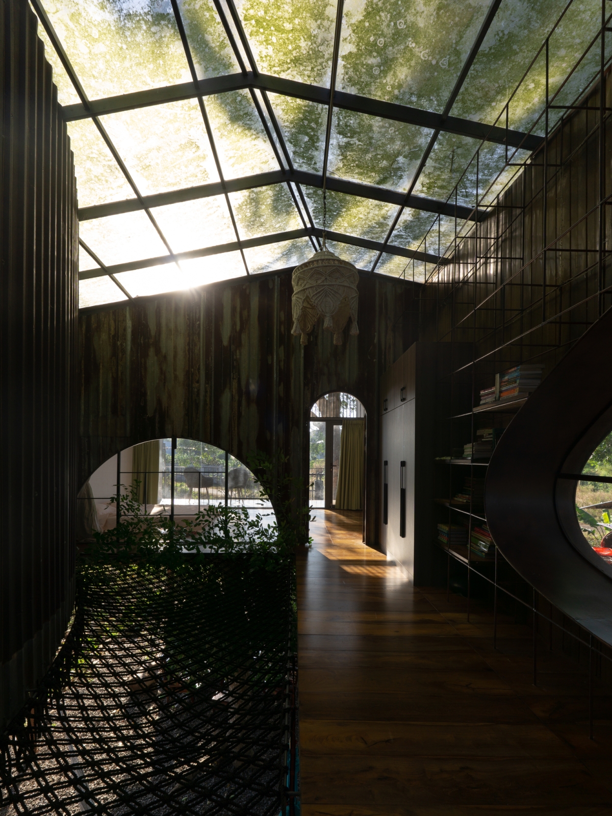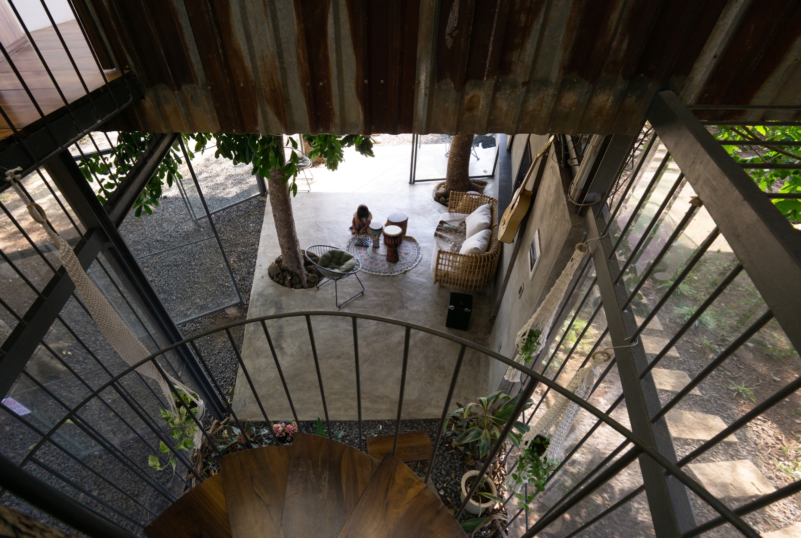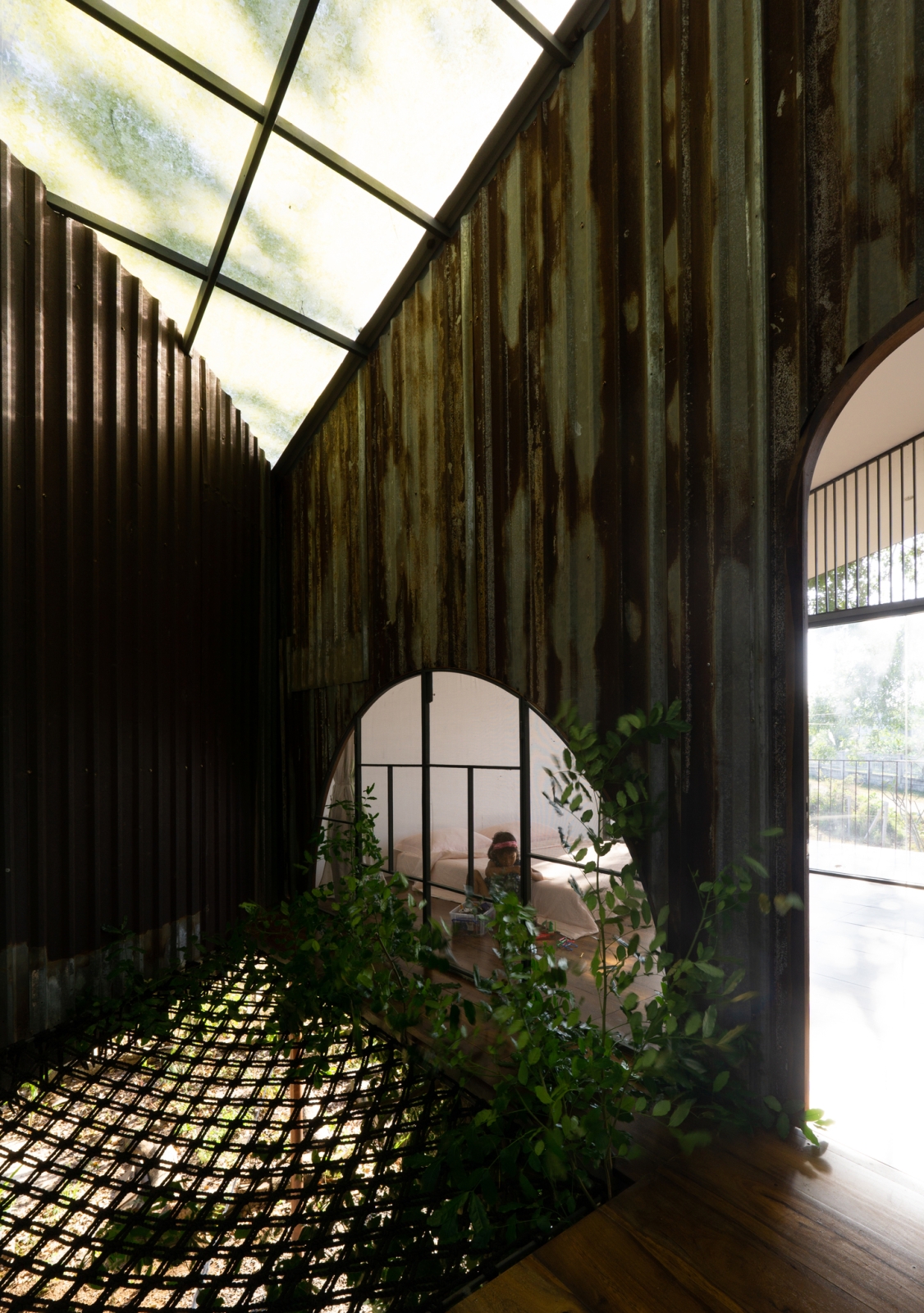 • Tầng 2: Là một khối nhà chuyển động hinh học được bao che bởi lớp tôn cũ tận dụng tao cảm giác khôi công trình không tách biệt quá so vơi rừng cây. Tầng 02 gồm 2 phòng ngủ cho bố mẹ và con gái nhỏ. Điểm nhấn của tầng 02 là khu vực sinh hoat chung giữa nhà vơi cac mảng tường cong, mái sáng, lưới chơi tạo cảm giác hòa minh vào thiên nhiên một cach tuyệt đối.