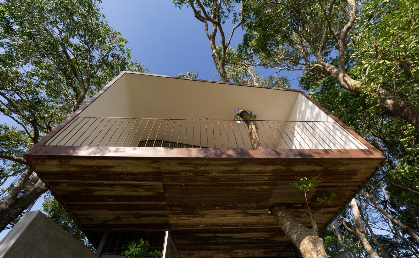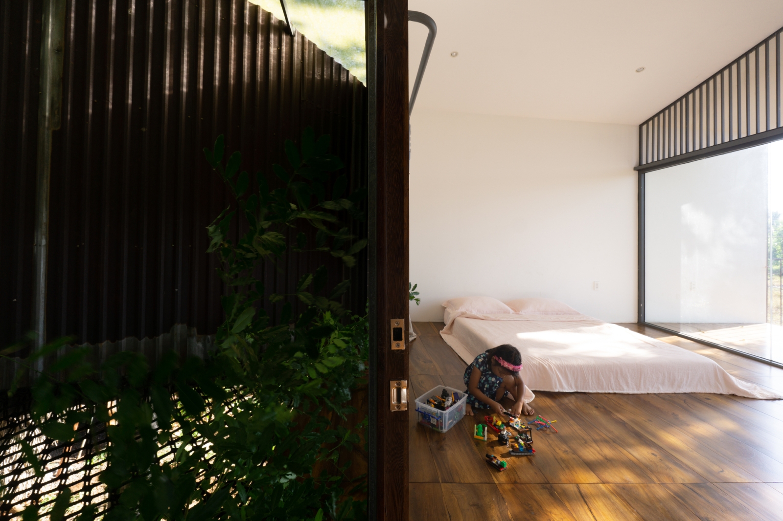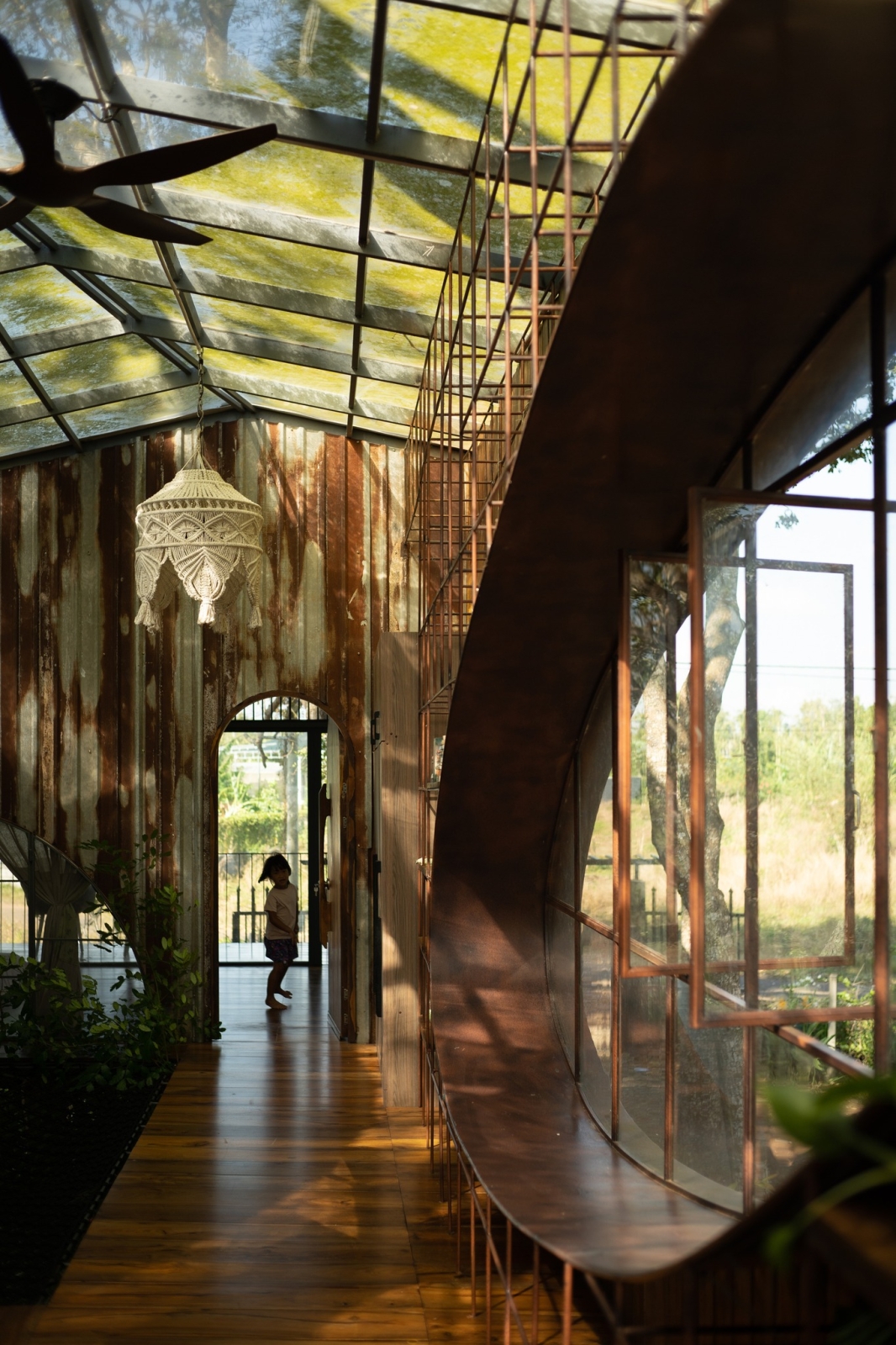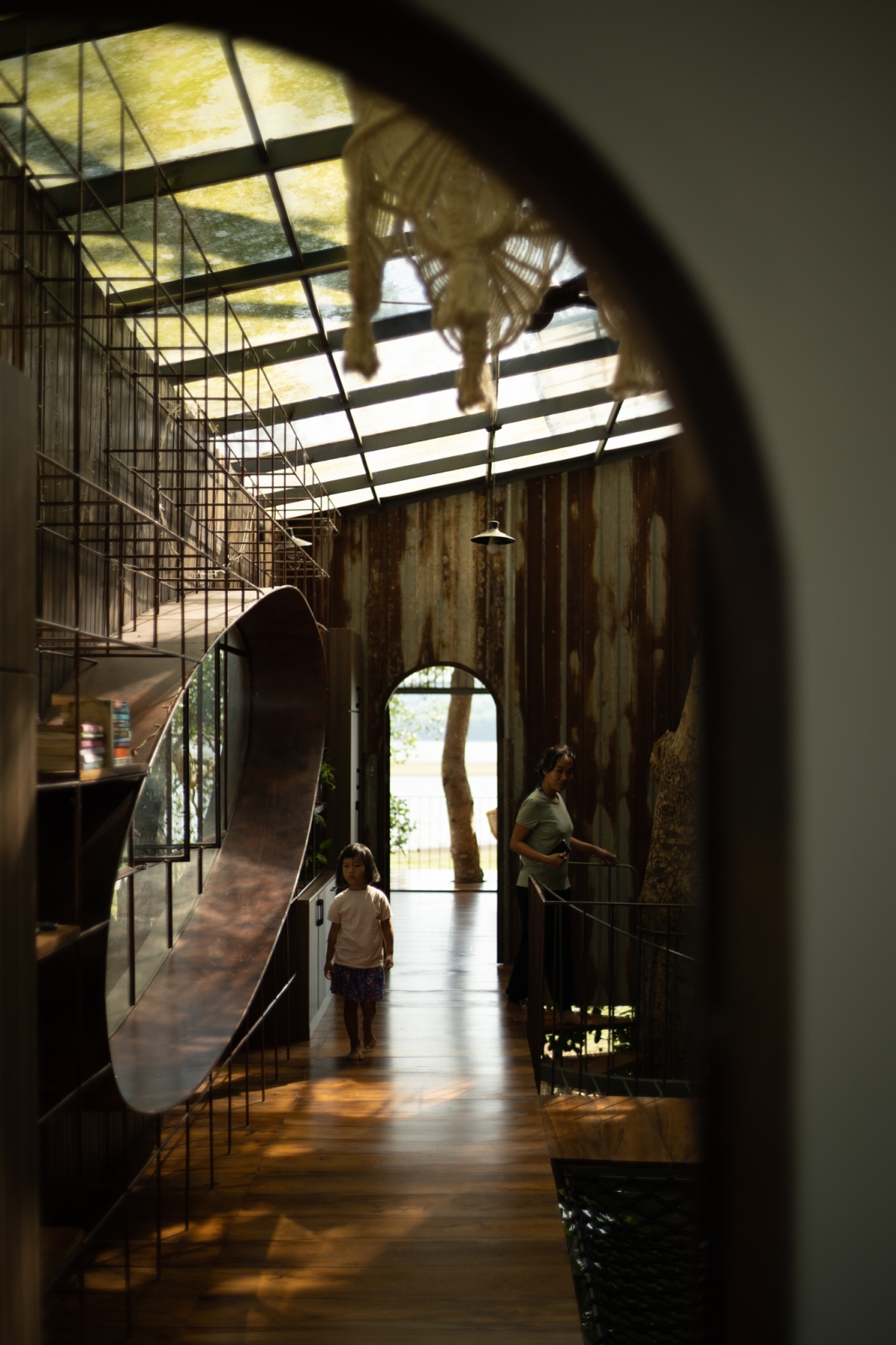 • Tầng 2: Là một khối nhà chuyển động hinh học được bao che bởi lớp tôn cũ tận dụng tao cảm giác khôi công trình không tách biệt quá so vơi rừng cây. Tầng 02 gồm 2 phòng ngủ cho bố mẹ và con gái nhỏ. Điểm nhấn của tầng 02 là khu vực sinh hoat chung giữa nhà vơi cac mảng tường cong, mái sáng, lưới chơi tạo cảm giác hòa minh vào thiên nhiên một cach tuyệt đối.