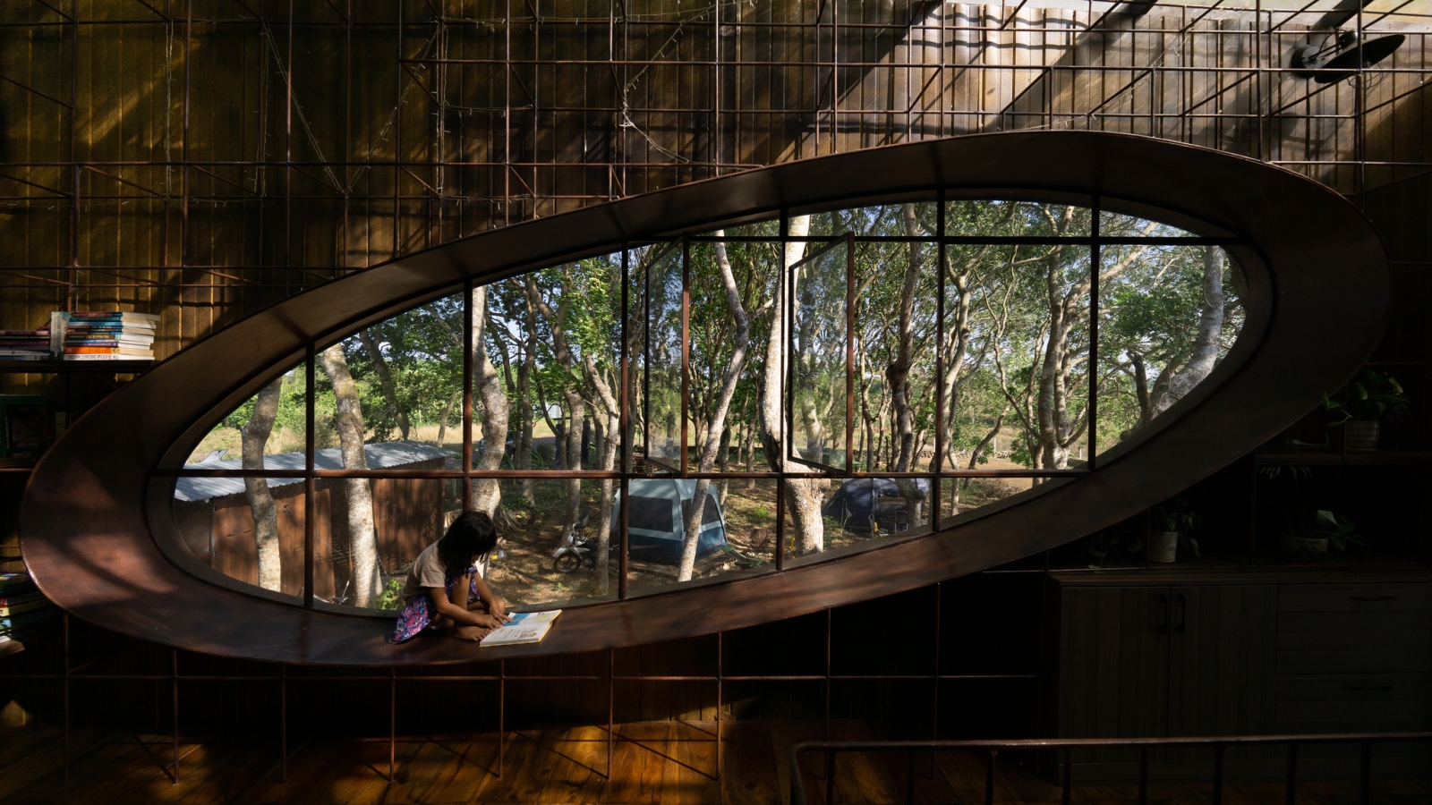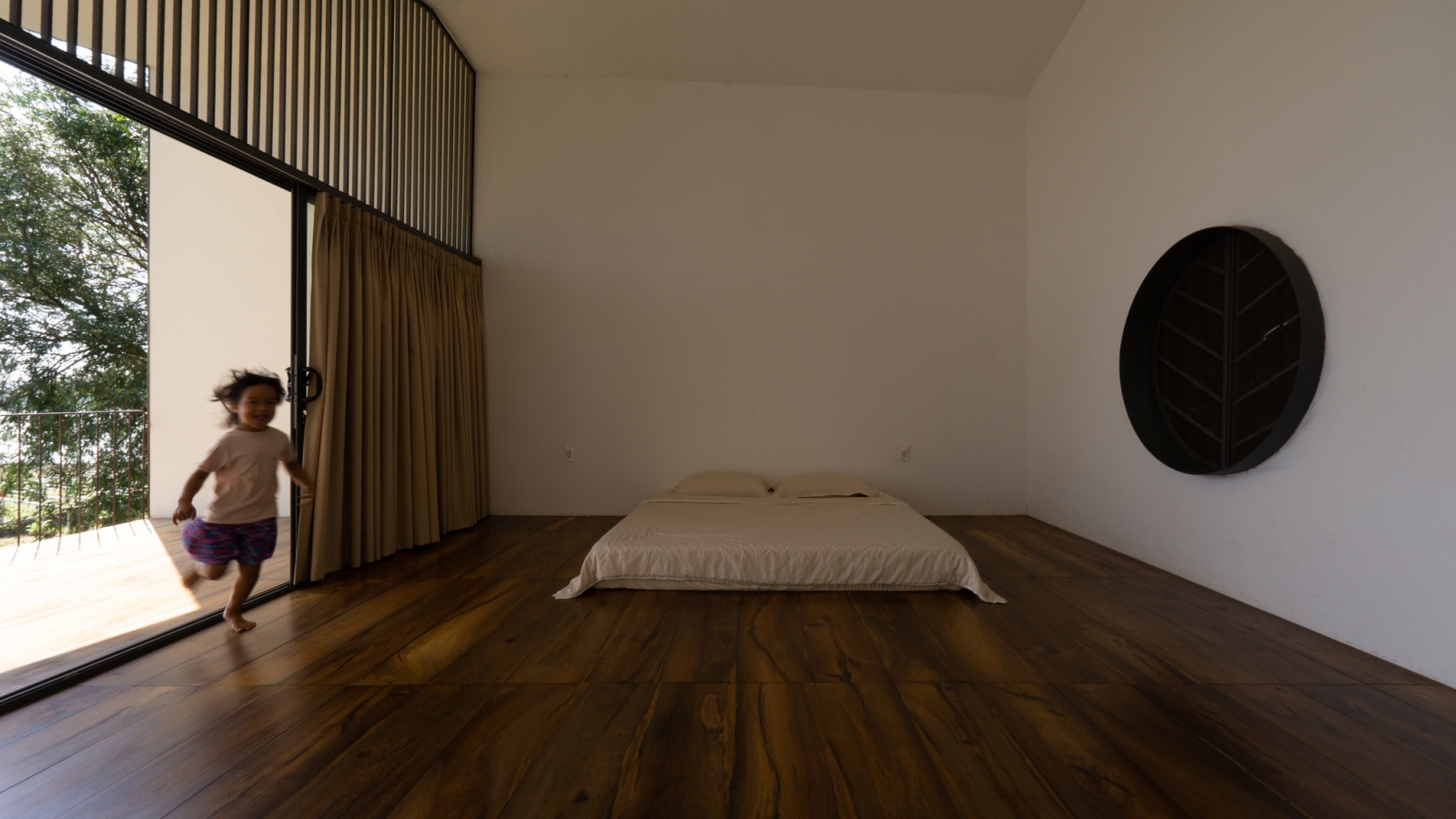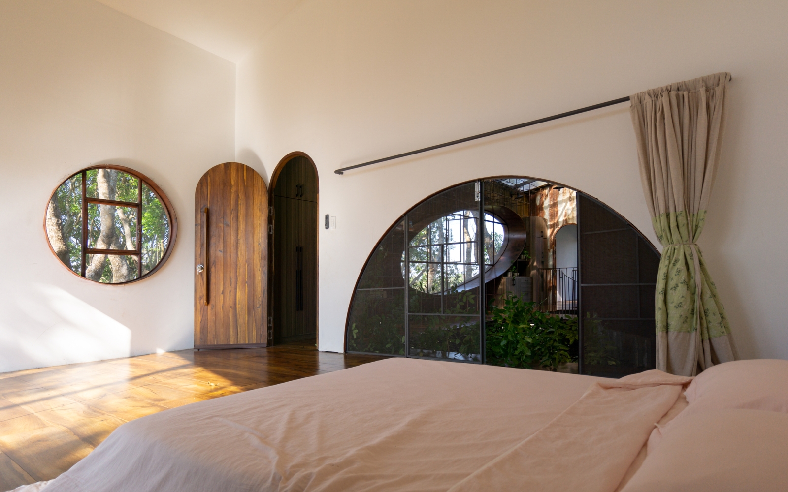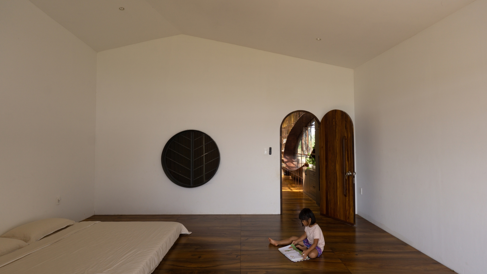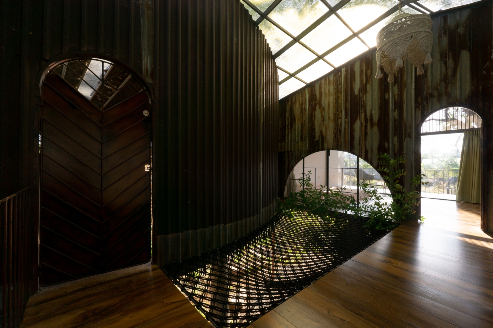 • Tầng 2: Là một khối nhà chuyển động hinh học được bao che bởi lớp tôn cũ tận dụng tao cảm giác khôi công trình không tách biệt quá so vơi rừng cây. Tầng 02 gồm 2 phòng ngủ cho bố mẹ và con gái nhỏ. Điểm nhấn của tầng 02 là khu vực sinh hoat chung giữa nhà vơi cac mảng tường cong, mái sáng, lưới chơi tạo cảm giác hòa minh vào thiên nhiên một cach tuyệt đối.