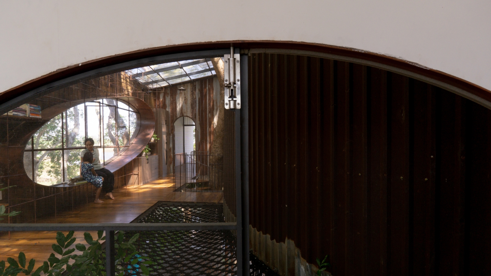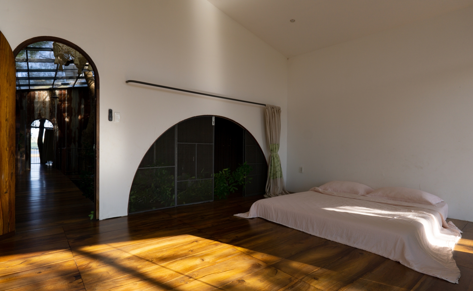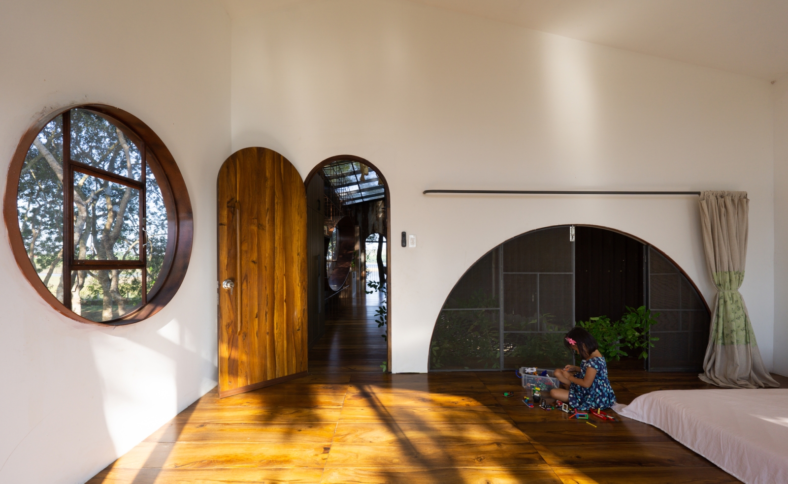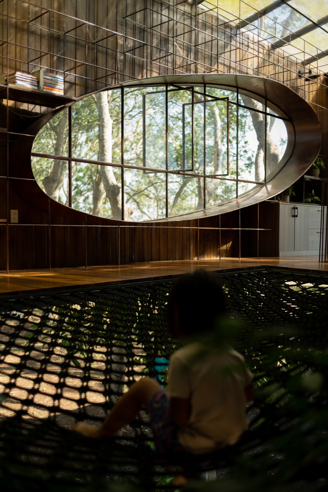 • Tầng 2: Là một khối nhà chuyển động hinh học được bao che bởi lớp tôn cũ tận dụng tao cảm giác khôi công trình không tách biệt quá so vơi rừng cây. Tầng 02 gồm 2 phòng ngủ cho bố mẹ và con gái nhỏ. Điểm nhấn của tầng 02 là khu vực sinh hoat chung giữa nhà vơi cac mảng tường cong, mái sáng, lưới chơi tạo cảm giác hòa minh vào thiên nhiên một cach tuyệt đối.