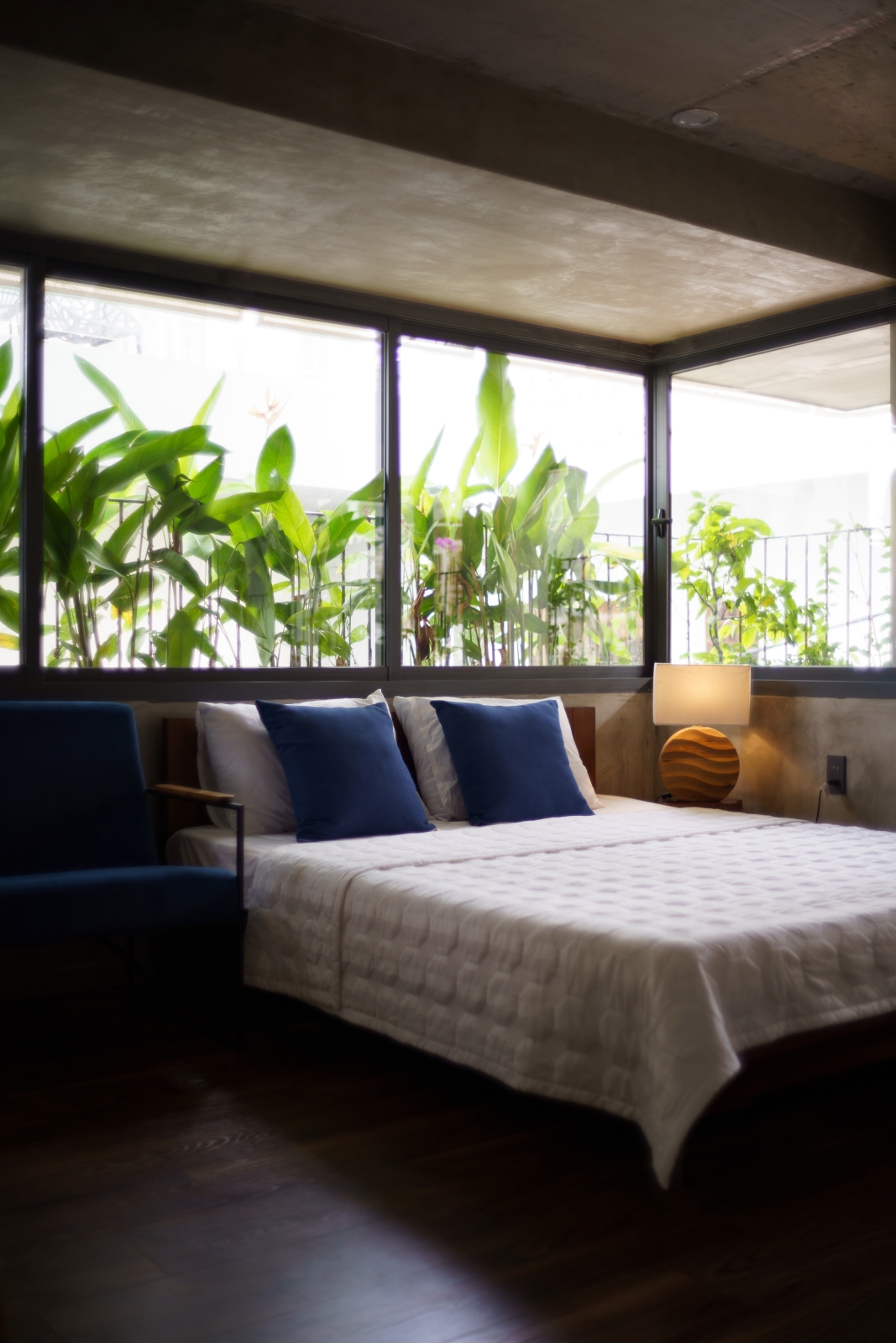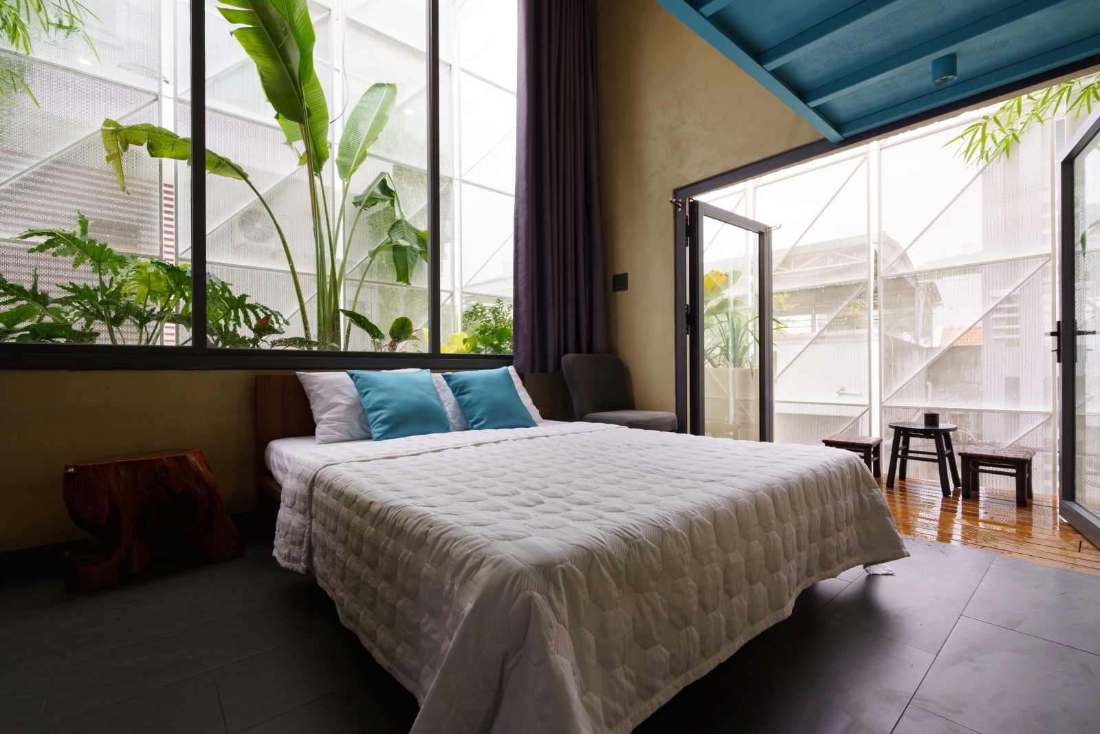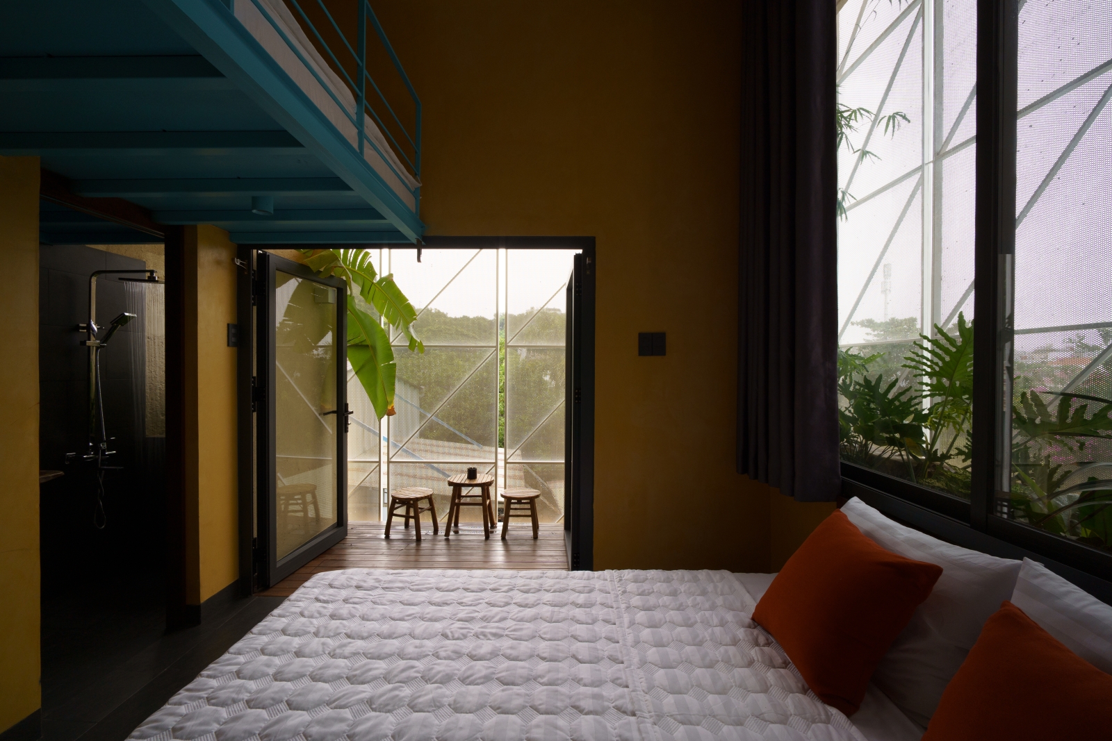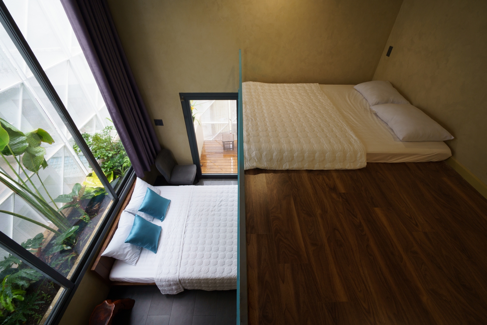 • Tầng 3: Là 02 phòng douplex lớn có ban công cây xanh mướt bao quanh, phía ngoài bao phủ bởi một lớp lưới ruồi để che bớt tầm nhìn vào bên trong căn phòng, lớp lưới sắt đã phần nào ẩn đi khung cảnh nhà cửa và những sinh hoạt thường ngày của các nhà lân cận trong khu phố. Một không gian tương phản với cuộc sống trầm lặng ẩn hiện phía sau những bức tường đúc bê tông thô mộc mạc nhưng cũng không kém vẻ sang trọng và độc đáo. Riêng người ở bên trong ngôi nhà sẽ tận hưởng vẽ đẹp của căn phòng nói riêng và căn nhà nói chung một cách trọn vẹn nhất.
