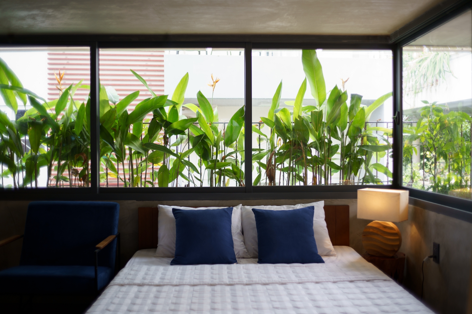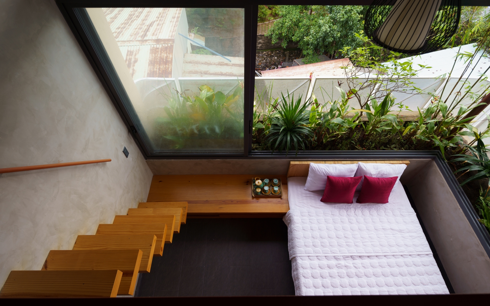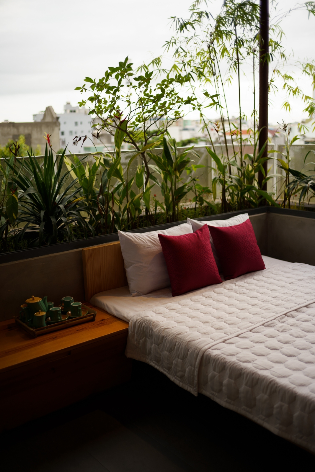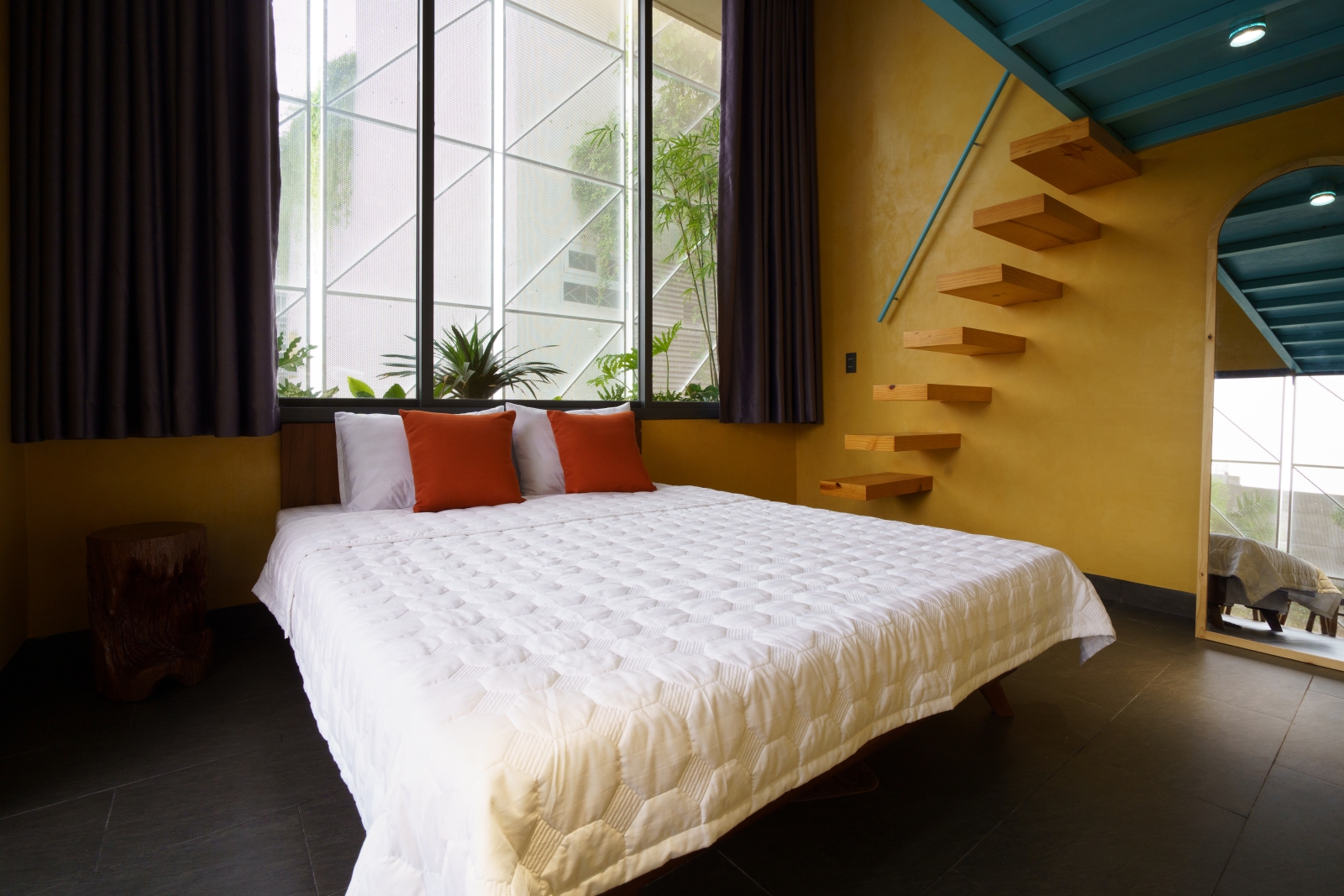 • Tầng 3: Là 02 phòng douplex lớn có ban công cây xanh mướt bao quanh, phía ngoài bao phủ bởi một lớp lưới ruồi để che bớt tầm nhìn vào bên trong căn phòng, lớp lưới sắt đã phần nào ẩn đi khung cảnh nhà cửa và những sinh hoạt thường ngày của các nhà lân cận trong khu phố. Một không gian tương phản với cuộc sống trầm lặng ẩn hiện phía sau những bức tường đúc bê tông thô mộc mạc nhưng cũng không kém vẻ sang trọng và độc đáo. Riêng người ở bên trong ngôi nhà sẽ tận hưởng vẽ đẹp của căn phòng nói riêng và căn nhà nói chung một cách trọn vẹn nhất.