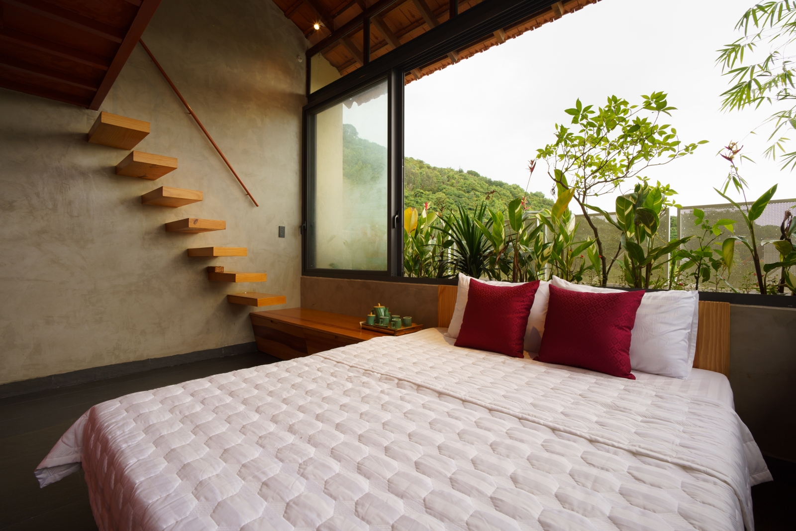 Điểm nhấn của căn phòng là kết cấu mái ngói đất nung cổ kính bên trên và các vách kính cao xung quanh làm lộ ra quang cảnh thiên nhiên tuyệt đẹp và lãng mạn của ngọn Hải Đăng núi lớn phía sau công trình.