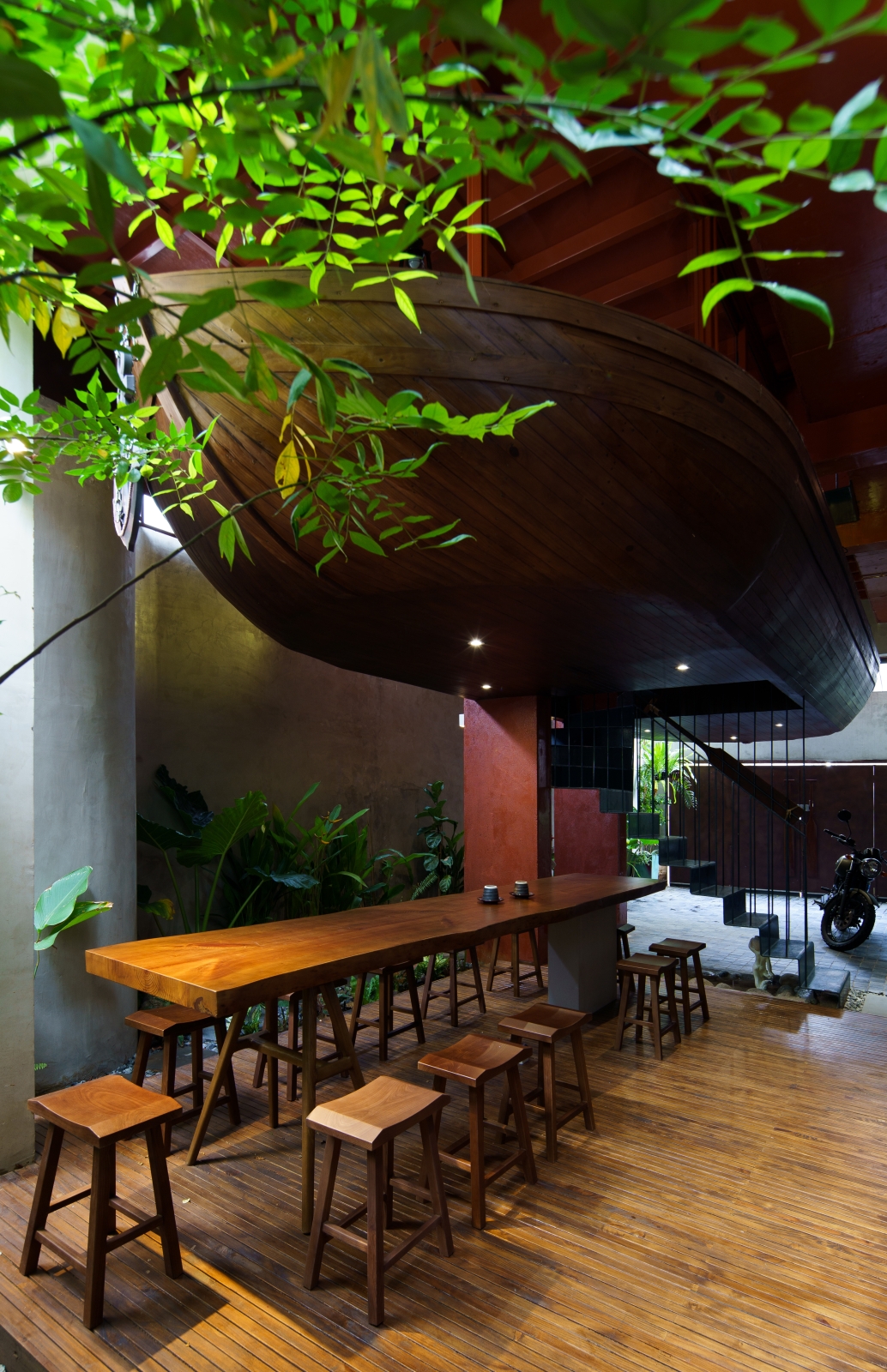• Tầng 2: Điểm nhấn độc đáo là một con thuyền lớn được treo cùng hệ khung thép chắc chắn với 2 phòng khách phía trên boong thuyền và 2 phòng ngủ rất chill bên dưới lòng thuyền. Với tông màu như một chiếc thuyền thật cùng với vật liệu gỗ thô mộc bên trong phòng ngủ đã tạo cảm giác cho người ngủ như đang trên du thuyền ra khơi.